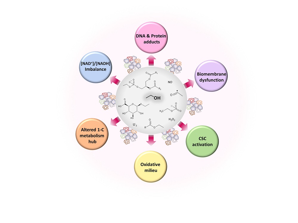 The World Health Organization identifies alcohol as a cause in several neoplasias of the oro-pharynx cavity, esophagus, gastrointestinal tract, larynx, liver, or female breast. This study re-views ethanol's nonoxidative and oxidative metabolism and one-carbon metabolism that en-compasses both redox and transfer reactions that influence crucial cell proliferation machinery. Ethanol favors the uncontrolled production and action of free radicals that interfere with the maintenance of essential cellular functions. We focus on the generation of protein, DNA, and lipid adducts that interfere with the cellular processes related to growth and differentiation. Ethanol's effects on stem cells responsible for building and repairing tissues are reviewed. Cancer stem cells suffer disturbances related to the expression of cell surface markers, enzymes, and transcription factors after ethanol exposure with consequent dysregulation of mechanisms related to cancer metastasis or resistance to treatments. Our analysis aims to underlie and discuss potential targets that show more sensitivity to ethanol's action and identify specific metabolic routes and metabolic realms that may be corrected to recover metabolic homeostasis after pharmacological interven-tion. Specifically, research should pay attention to reestablish metabolic fluxes by fine-tuning the functioning of specific pathways related to one-carbon metabolism and antioxidant processes.