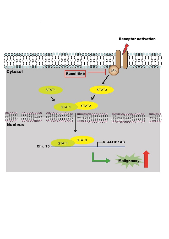 Cholangiocarcinoma is the most common primary malignant tumor of the bile duct. The current standard first-line treatment for advanced or metastatic cholangiocarcinoma is gemcitabine and cisplatin. However, few effective treatment choices exist for refractory cholangiocarcinoma, and additional therapeutic drugs are urgently required. Our previous work demonstrated that the ALDH isoform 1A3 plays a vital role in the malignant behavior of cholangiocarcinoma and may serve as a new therapeutic target. In this study, we found a positive correlation between ALDH1A3 protein expression levels and cell migration abilities of three cholangiocarcinoma cell lines, which was verified using ALDH1A3-overexpressing and ALDH1A3-knockdown clones. We also used ALDH1A3-high and ALDH1A3-low populations of cholangiocarcinoma cell lines from the Library of Integrated Network-based Cellular Signatures (LINCS) program and assessed the effects of ruxolitinib, a commercially available JAK2 inhibitor. Ruxolitinib had a higher cytotoxic effect when combined with gemcitabine. Furthermore, the nuclear translocation STAT1 and STAT3 heterodimers were markedly diminished by ruxolitinib treatment, possibly resulting in decreased ALDH1A3 activation. Notably, ruxolitinib alone or combined with gemcitabine led to significantly reduced tumor size and weight. Collectively, our studies suggest that ruxolitinib might suppress the ALDH1A3 activation through the JAK2/STAT1/3 pathway in cholangiocarcinoma, and trials should be undertaken to evaluate its efficacy in clinical therapy.