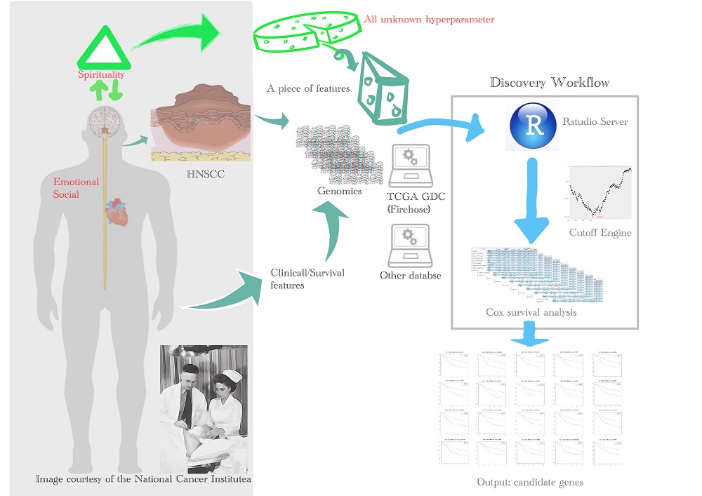 The survival analysis of the Cancer Genome Atlas (TCGA) dataset is a well-known method to discover the gene expression-based prognostic biomarkers of head and neck squamous cell carcinoma (HNSCC). A cutoff point is usually used in survival analysis for the patients' dichotomization in the continuous gene expression. There is some optimization software for cutoff determination. However, the software's predetermined cutoffs are usually set at the median or quantiles of gene expression value to perform the analyses. There are also few clinicopathological features available on their pre-processed data sets. We applied an in-house workflow, including data retrieving and pre-processing, feature selection, sliding-window cutoff selection, Kaplan-Meier survival analysis, and Cox proportional hazard modeling for biomarker discovery. In our approach for the TCGA HNSCC cohort, we scanned human protein-coding genes to find optimal cutoff values. After adjustment with confounders, the clinical tumor stage and the surgical margin involvement are independent risk factors for patients' prognosis. According to the resulting tables with Bonferroni-adjusted P value under the optimal cutoff and the hazard ratio, three biomarker candidates, CAMK2N1, CALML5, and FCGBP, are significantly associated with the patients' overall survival. We validated this discovery by using the other independent HNSCC dataset (GSE65858). Thus, we suggest the transcriptomic analysis could help for biomarker discovery.