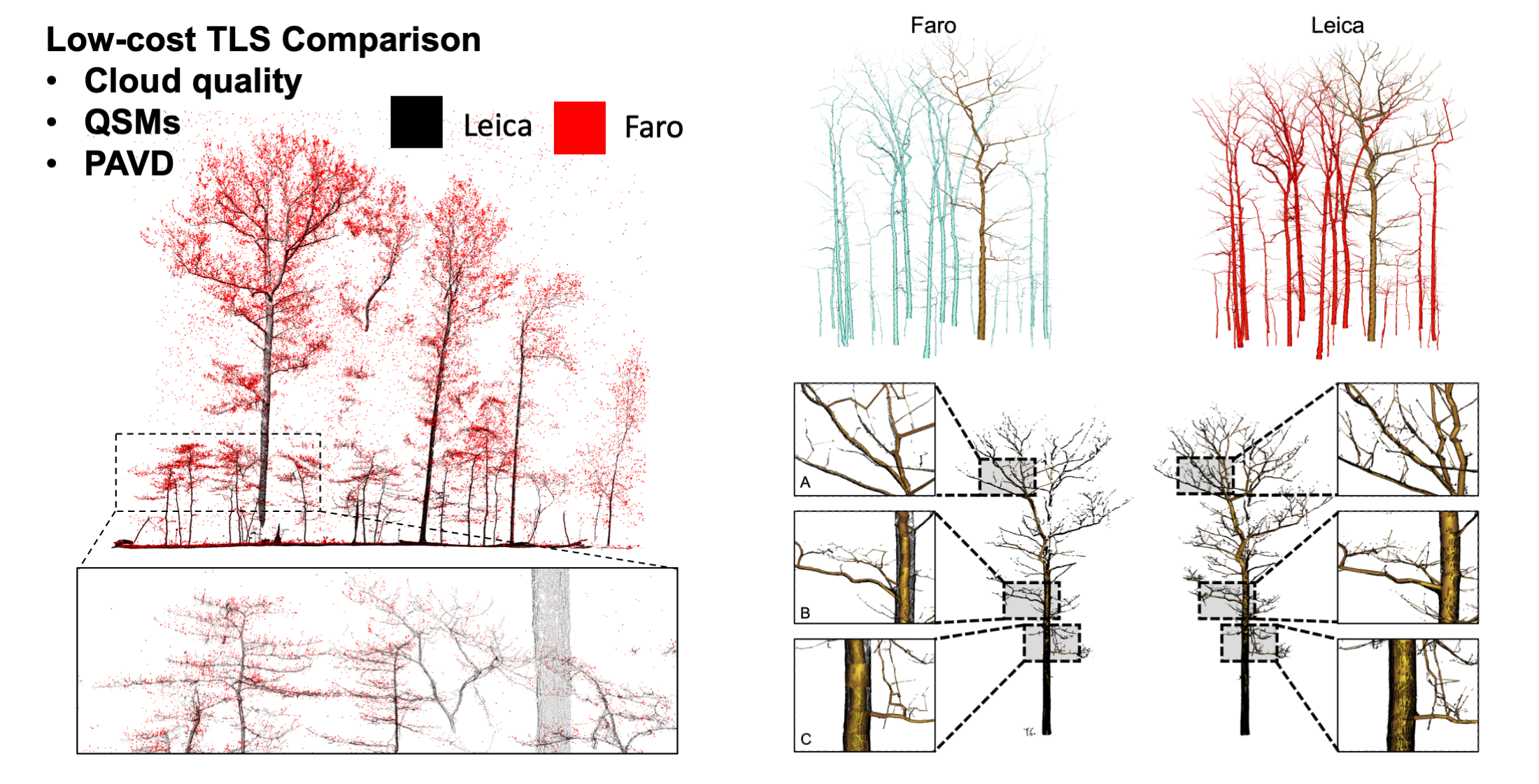 The increasingly affordable price point of terrestrial laser scanners has led to a democratization of instrument availability, but the most common low-cost instruments have yet to be compared in terms of the consistency to measure forest structural attributes. Here, we compared two low-cost terrestrial laser scanners (TLS): the Leica BLK360 and the Faro Focus 120 3D. We evaluate the instruments in terms of point cloud quality, forest inventory estimates, tree-model reconstruction, and foliage profile reconstruction. Our direct comparison of the point clouds showed reduced noise in filtered Leica data. Tree diameter and height were consistent across instruments (4.4% and 1.4% error, respectively). Volumetric tree models were less consistent across instruments, with ~29% bias, depending on model reconstruction quality. In the process of comparing foliage profiles, we conducted a sensitivity analysis of factors affecting foliage profile estimates, showing a minimal effect from instrument maximum range (for forests less than ~50 m in height) and surprisingly little impact from degraded scan resolution. Filtered unstructured TLS point clouds must be artificially re-gridded to provide accurate foliage profiles. The factors evaluated in this comparison point towards necessary considerations for future low-cost laser scanner development and application in detecting forest structural parameters.