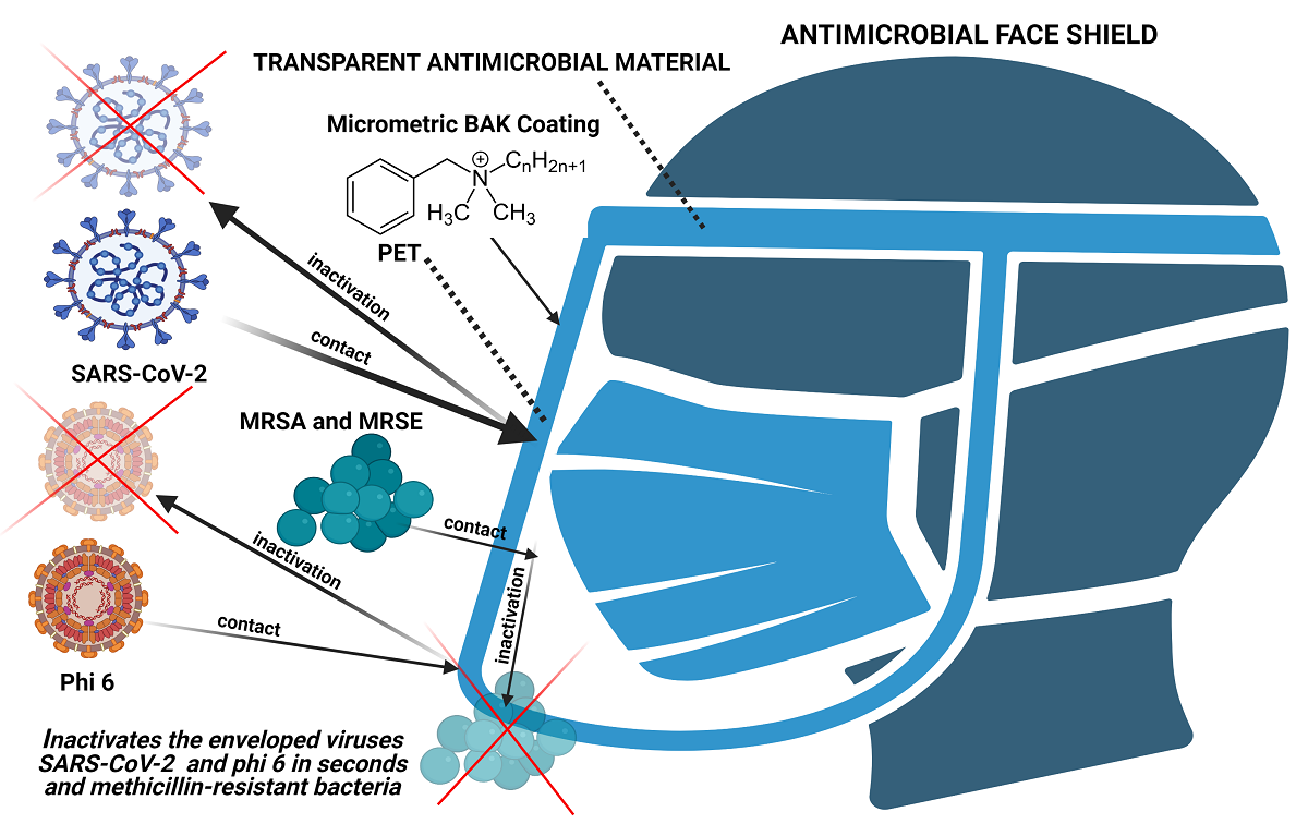 Transparent materials used for facial protection equipment provide protection against microbial infections caused by viruses and bacteria, including multidrug-resistant strains. However, transparent materials used for this type of application are made of materials that do not possess antimicrobial activity. They just avoid direct contact between the person and the biological agent. Therefore, healthy people can get infected through contact of the contaminated material surfaces and this equipment constitute an increasing source of infectious biological waste. Furthermore, infected people can transmit microbial infections easily because the protective equipment do not inactivate the microbial load generated while breathing, sneezing, or coughing. In this regard, the goal of this work consisted of fabricating a transparent face shield with intrinsic antimicrobial activity that could provide extra-protection against infectious agents and reduce the generation of infectious waste. Thus, a single-use transparent antimicrobial face shield composed of polyethylene terephthalate and an antimicrobial coating of benzalkonium chloride has been developed for the next generation of facial protective equipment. The antimicrobial coating was analyzed by atomic force microscopy and field emission scanning electron microscopy with elemental analysis. This is the first facial transparent protective material capable of inactivating enveloped viruses such as SARS-CoV-2 in less than one minute of contact, and the methicillin-resistant Staphylococcus aureus and Staphylococcus epidermidis. Bacterial infections contribute to severe pneumonia associated with the SARS-CoV-2 infection, and their resistance to antibiotics is increasing. Our extra protective broad-spectrum antimicrobial composite material could also be applied for the fabrication of other facial protective tools such as such as goggles, helmets, plastic masks and space separation screens used for counters or vehicles. This low-cost technology would be very useful to combat the current COVID-19 pandemic and protect health care workers from multidrug-resistant infections in developed and underdeveloped countries.