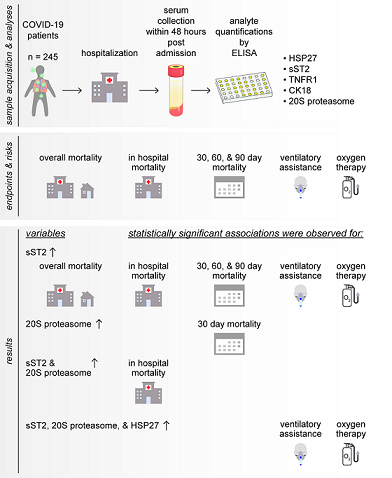 Although, severe acute respiratory syndrome coronavirus – 2 (SARS-CoV 2) represents one of the biggest challenges in the world today, the exact immunopathogenic mechanism that leads to severe or critical Coronavirus Disease 2019 (COVID-19) has remained incompletely understood. Several studies have indicated that high systemic plasma levels of inflammatory cytokines result in the so-called “cytokine storm”, with subsequent development of microthrombosis, disseminated intravascular coagulation, and multiorgan-failure. Therefore, we reasoned that elevated inflammatory cytokine might act as prognostic factors. Here, we analyzed 245 serum samples of patients with COVID-19, collected at hospital admission. We assessed the levels of heat shock protein 27 (HSP27), soluble suppressor of tumorigenicity- 2 (sST2), caspase cleaved cytokeratin 18 (cCK18), 20S proteasome, and tumor necrosis factor receptor 1 (TNFR-1) and explored their associations with overall-, 30-, 60-, 90-day- and in-hospital mortality. Moreover, we investigated their association with the risk of ventilation. We demonstrated that increased serum sST2 was uni- and multivariably associated with all endpoints. However, we also identified 20S proteasome as independent prognostic factor for in-hospital mortality. Furthermore, elevated HSP27, sST2, and 20S proteasome levels at hospital admission were univariably associated with higher risk of invasive ventilation. These findings could help to identify high-risk patients early in the course of COVID-19.