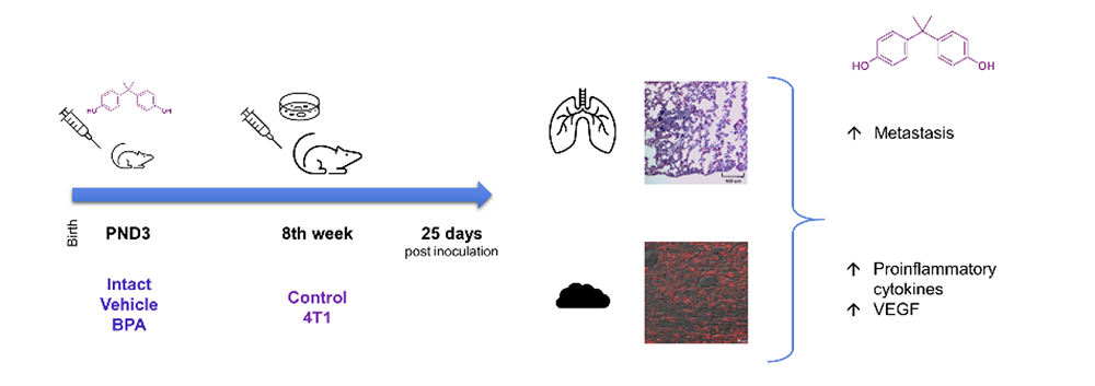 Background: Metastasis is a complex process that involves the spread of the tumor to distant parts of the body from its original site. Metastatic dissemination represents the main physiopathology of cancer. Soluble factors such as cytokines have been closely related to breast cancer (BC) metastasis. Bisphenol A (BPA) is an endocrine disrupting chemical compound with estrogenic properties, which exposure in the early stages of neonatal life leads to an increase in the size and weight of breast tumors and cellular changes in the tumoral immune microenvironment. Methods: Thus, we used female BALB/c mice that were exposed neonatally to a single dose of BPA. Once sexual maturity was reached, a mammary tumor was induced injecting 4T1 cells in situ. After 25 days of injection, we evaluated endocrine alterations, cytokine expression, tissue alterations denoted by macro and micro metastases in the lung, and metastasis-induced cell infiltration. Results: BPA neonatal treatment did not show significant endocrine alterations. Nevertheless, BPA induced a great rate of metastasis to the lung associated with higher intratumoral expression of IL-1b, IL-6, IFN-g, TNF-a and VEGF. Conclusions Our data suggest that cytokines are key players in BC metastasis induction, and that BPA is a risk factor to be considered. This knowledge must be considered with the aim of recognizing environmental pollution in the clinical history of patients to possibly counter BC metastases.