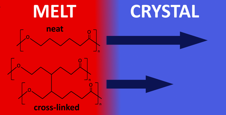 The crystal nucleation and overall crystallization kinetics of cross-linked poly(ε-caprolactone) was studied experimentally by fast scanning calorimetry in a wide temperature range. With an increasing degree of cross-linking, both the nucleation and crystallization half-times increase. Concurrently, the glass transition range shifts to higher temperatures. In contrast, the temperatures of the maximum nucleation and the overall crystallization rates remain the same independent of the degree of cross-linking. The cold crystallization peak temperature generally increases as a function of heating rate, reaching an asymptotic value near the temperature of the maximum growth rate. A theoretical interpretation of these results is given in terms of classical nucleation theory. In addition, it is shown that the average distance between the nearest cross-links is smaller than the estimated lamellae thickness, which indicates the inclusion of cross-links in the crystalline phase of the polymer.