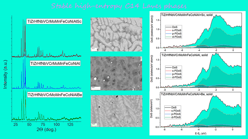 One of the intriguing recent results in the field of high-entropy alloys is the discovery of single-phase equiatomic multi-component Laves intermetallics. However, there is no clear understanding that a combination of chemical elements will form such high-entropy compounds. Here we contribute to understanding this issue by modifying the composition of duodenary TiZrHfNbVCrMoMnFeCoNiAl (12x) alloy in which we recently reported the fabrication of hexagonal C14 Laves phase. We consider three alloys based on 12x: 7x=12x-VCrMoMnFe, 12x+Sc, 12x+Be and observe that all of them crystalize with the formation of C14 Laves phase as a dominant structure. We report that 12x+Be alloy reveals single-phase C14 structure with very high concentration of structural defects and ultra-fine dendritic microstructure with almost homogenous distribution of the constituted elements over the alloy matrix. The 7x and 12x+Sc alloys contain C14 as a main phase and unknown impurity phases. To characterize the materials, we examine their heat capacity, electrical conductivity and magnetic properties. The measurements reveal that the Laves phases are Curie-Weiss paramagnets, which demonstrate metallic conduction; 7x and 12x alloys also reveal a pronounced Kondo-like anomaly. Analysis of experimental data as well as ab initio calculations suggests that chemical complexity and compositional disorder cause strong s-d band scattering and thus the rather high density of d-states in the conduction band. Analysis of the results suggests that the mechanism of Laves phase formation in multicomponent multi-principal element metallic alloys is may be the same as in polydisperse hardspheres mixtures. Another important conclusion is that the configurational entropy is a negligible factor in the stabilization of multi-element Laves phases.