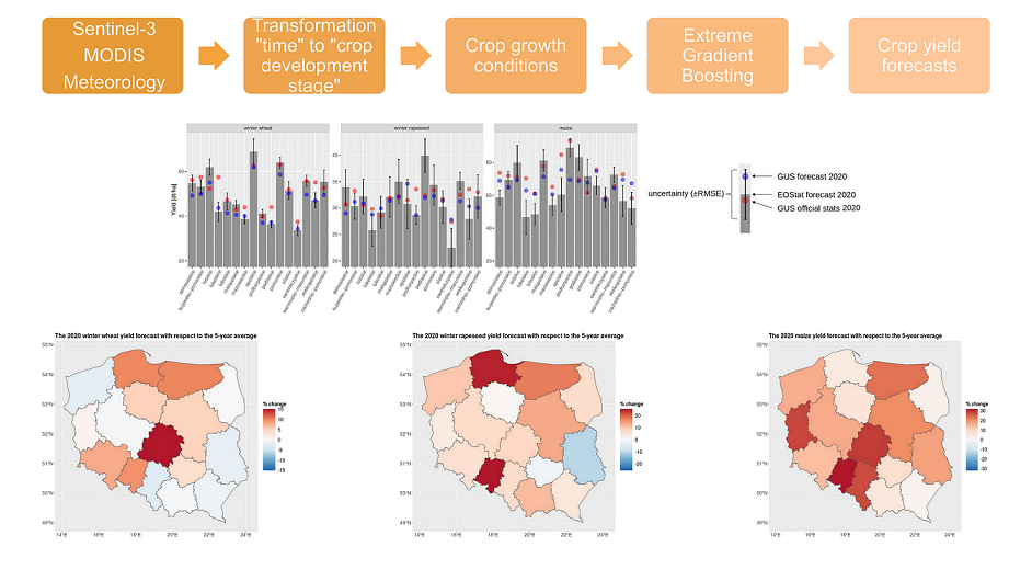 Timely crop yield forecasts at national level are substantial to support food policies, to assess agricultural production and to subsidize regions affected by food shortage. This study presents an operational crop yield forecasting system for Poland that employs freely available satellite and agro-meteorological products provided by the Copernicus programme. The crop yield predictors consist of: (1) vegetation condition indicators provided daily by Sentinel-3 OLCI (optical) and SLSTR (thermal) imagery, (2) a backward extension of Sentinel-3 data (before 2018) derived from cross-calibrated MODIS data, (3) air temperature, total precipitation, surface radiation, and soil moisture derived from ERA-5 climate reanalysis generated by the European Centre for Medium-Range Weather Forecasts. The crop yield forecasting algorithm is based on thermal time (growing degree days derived from ERA-5 data) to better follow the crop development stage. The recursive feature elimination is used to derive an optimal set of predictors for each administrative unit, which are ultimately employed by the Extreme Gradient Boosting regressor to forecast yields using official yield statistics as a reference. According to intensive leave-one-year-out cross validation for 2000–2019 period, the relative RMSE for NUTS-2 units are: 8% for winter wheat, and 13% for winter rapeseed and maize. Respectively, for the LAU units it equals 14% for winter wheat, 19% for winter rapeseed, and 27% for maize. The system is designed to be easily applicable in other regions and to be easily adaptable to cloud computing environments (such as DIAS or Amazon AWS), where data sets from the Copernicus programme are directly accessible.
