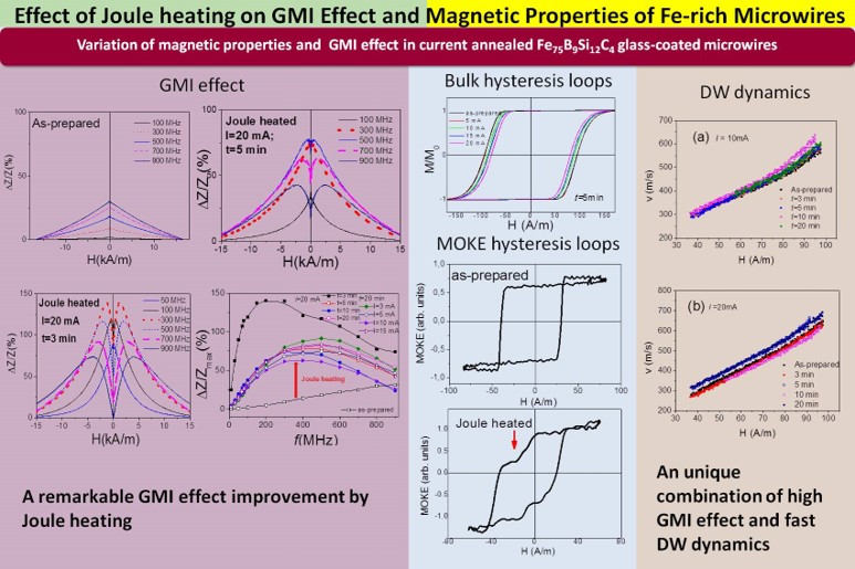 Influence of Joule heating on magnetic properties, giant magnetoimpedance (GMI) effect and domain wall (DW) dynamics of Fe75B9Si12C4 glass-coated microwires was studied. A remarkable increase in GMI ratio is observed in Joule heated samples. The hysteresis loops of Joule heated samples maintain a rectangular shape, while a slight decrease in coercivity after Joule heating is observed. On the other hand, a modification of MOKE hysteresis loops is observed upon Joule heating. Additionally, DW dynamics improvement after Joule heating is observed. The observed GMI ratio improvement along with the change in MOKE loops and DW dynamics improvement has been discussed considering magnetic anisotropy induced by Oersted magnetic field in the surface layer during Joule heating and the internal stress relaxation. A remarkable GMI ratio im-provement observed in Fe-rich Joule-heated microwires with a rectangular hysteresis loop and fast DW propagation, together with the fact that Fe is a more common and less expensive metal than Co, makes them suitable for use in magnetic sensors.