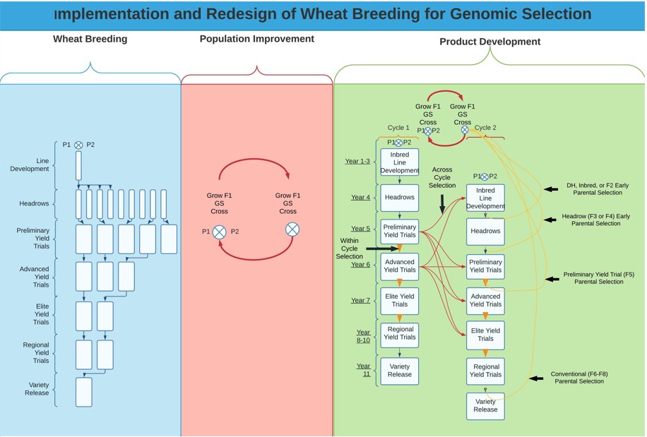Wheat (Triticum aestivum L.) breeding programs can take over a decade to release a new variety. However, new methods of selection such as genomic selection (GS) must be integrated to decrease the time it takes to release new varieties to meet the demand of a growing population. The implementation of GS into breeding programs is still being explored, with many studies showing its potential to change wheat breeding through achieving higher genetic gain. In this review, we explore the integration of GS for a wheat breeding program by redesigning the traditional breeding pipeline to implement GS. We propose implementing a two-part breeding strategy by differentiating between population improvement and product development. The implementation of GS in the product development pipeline can be integrated into most stages and can predict within and across breeding cycles. Additionally, we explore optimizing the population improvement strategy through GS recurrent selection schemes to reduce crossing cycle time and significantly increase genetic gain. The recurrent selection schemes can be optimized for parental selection, maintenance of genetic variation, and optimal cross-prediction. Overall, we outline the ability to increase the genetic gain of a breeding program by implementing GS and a two-part breeding strategy.