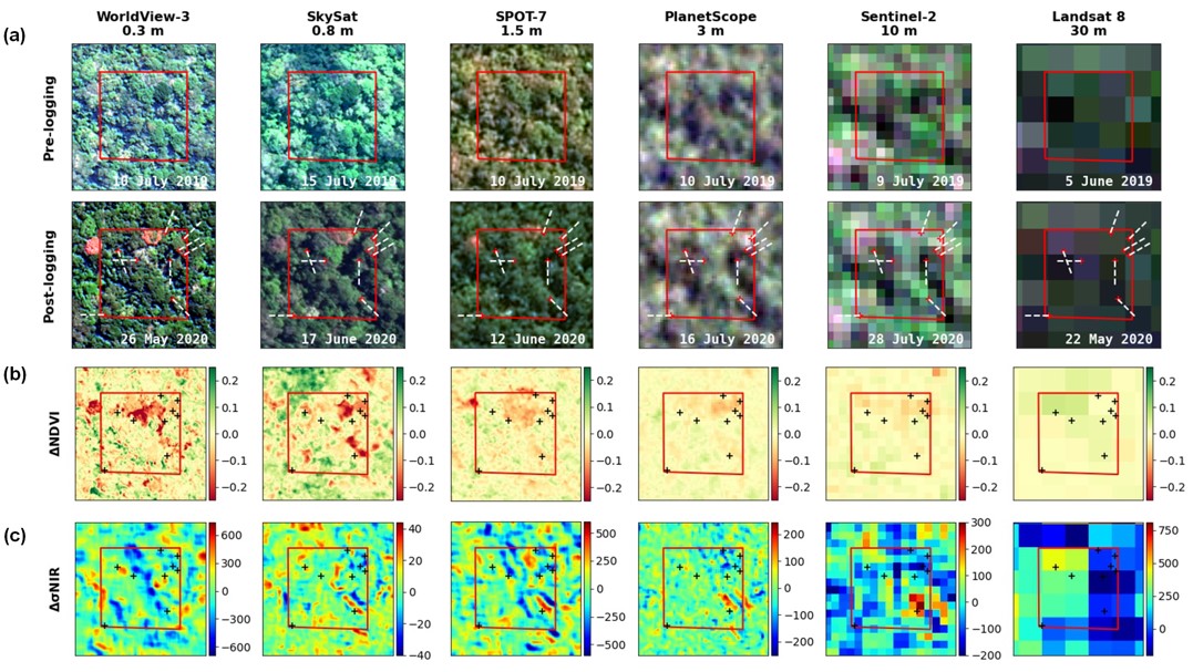 Forest degradation is known to be widespread in the tropics, but is currently very poorly mapped, in part because there is little quantitative data on which satellite sensor characteristics and analysis methods are best at detecting it. To improve this, we used data from the Tropical Forest Degradation Experiment (FODEX) plots in the southern Peruvian Amazon, where different numbers of trees had been removed from four 1 ha forest plots, carefully inventoried by hand and Terrestrial Laser Scanning before and after the logging to give a range of biomass change (ΔAGB) values. We conducted a comparative study of six multispectral optical satellite sensors (WorldView-3, SkySat, SPOT-7, PlanetScope, Sentinel-2 and Landsat 8) at 0.3 – 30 m spatial resolution, to find the best combination of sensor and remote sensing indicator for change detection. Spectral reflectance, the Normalized Difference Vegetation Index (NDVI) and texture parameters were extracted after radiometric calibration and image preprocessing. The strength of the relationships between the change in these values and field-measured ΔAGB (computed in % ha−1) was analysed. The results demonstrate that: (a) texture measures correlates more with ΔAGB than simple spectral parameters; (b) the strongest correlations are achieved for those sensors with spatial resolutions in the intermediate range (1.5 - 10 m), with finer or coarser resolutions producing worse results, and (c) when texture is computed using a moving square window ranging between 9 - 14 m in length. Maps predicting ΔAGB showed very promising results using a NIR-derived texture parameter for 3 m resolution PlanetScope (R2 = 0.97 and RMSE = 1.80 % ha−1), followed by 1.5 m SPOT-7 (R2 = 0.74 and RMSE = 5.25 % ha−1) and 10 m Sentinel-2 (R2 = 0.71 and RMSE = 5.55 % ha−1). Texture models derived from 0.3 m WorldView-3 improved with increasing window size, with highest R2 of 0.62 and RMSE = 6.35 % ha−1 for a window of 14 m in length. The degradation in our field plots is invisible to the 30 m resolution Landsat data. Our findings imply that, at least for lowland Peru, low-medium intensity disturbance can be detected best in optical wavelengths using a texture measure derived from 3 m PlanetScope data. That such data are being collected daily, and currently released free as monthly mosaics over tropical forests as part of the Norway’s International Climate and Forest Initiative (NICFI), is excellent news for monitoring such degradation.