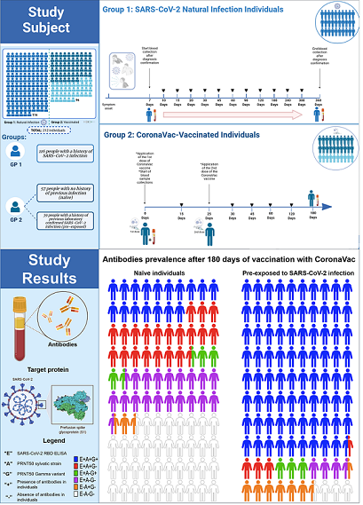 The COVID-19 pandemic is the biggest public health threat facing the globe today. Multiple vaccines have been approved, however the emergence of viral variants such as the recent Omicron, raises the possibility of booster doses to achieve adequate protection. In Brazil, the CoronaVac (Sinovac) vaccine was used, however it’s important to assess the immune response to this vaccine over time. This study aimed to monitor the anti-SARS-CoV-2 antibody responses in those immunized with CoronaVac and SARS-CoV-2 infected individuals. Samples were collected between August 2020 and August 2021. Within the vaccinated cohort, some individuals had history of infection by SARS-CoV-2 prior to immunization and others not. We analyzed RBD-specific and neutralizing- antibodies. Anti-RBD antibodies were detected in both cohorts, with a peak between 45-90 days post infection or vaccination, followed by a steady decline over time. In those with previous history of COVID-19, a higher, longer, more persistent response was observed. This trend was mirrored in the neutralization assays, where infection followed by immunization resulted in higher, longer lasting responses which were conditioned on the presence of levels of RBD antibodies right before the vaccination. This supports the necessity of booster doses of CoronaVac in due course to prevent serious disease.
