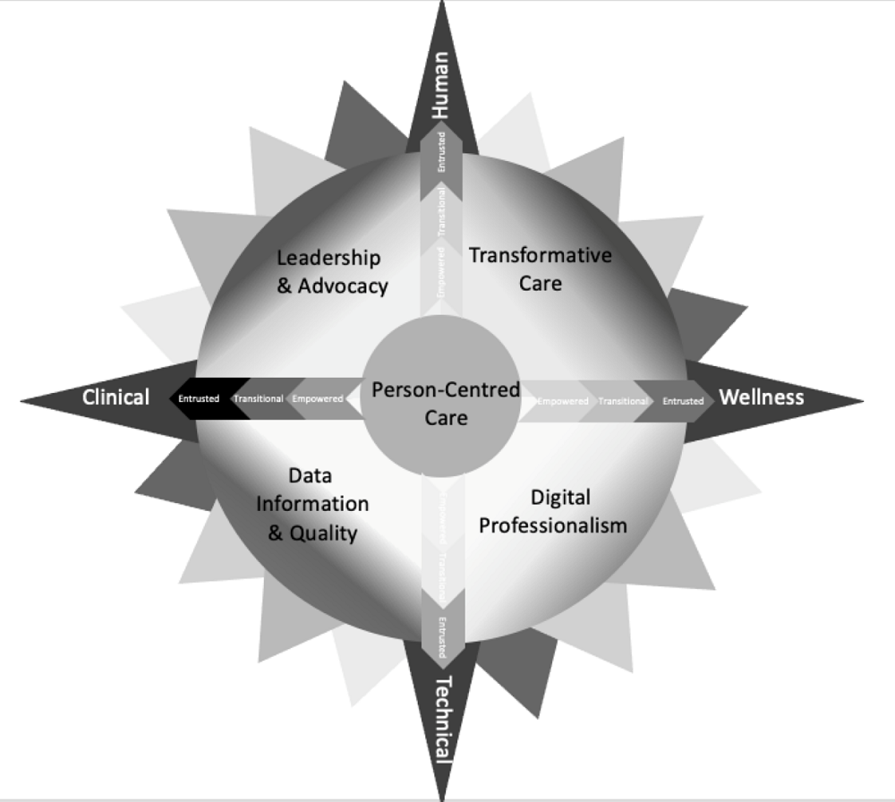 Digital health research is an emerging discipline that requires easy-to-understand theoretical frameworks and implementation models for digital health providers in health and social care settings. The COVID-19 pandemic has heightened demand for digital health discipline-specific instruction on ‘how to’ manage evidence-based digital health transformation. Access to the use of these models guarantees that digital health providers can investigate phenomena using safe and suitable approaches and methods to conduct research and identify answers to challenges and problems that arise in health and social care settings. The COMPASS theory is designed to aid transformation of health and social care environments. A navigational rose of primary quadrants is divided by four main compass points, with person-centred care being central to the philosophy. Two axes produce Cartesian planes that intersect to form a box plot, which can be used to discover human and physical resource weightings to augment digital health research design and implementation. A third continuum highlights stakeholders' capabilities, critical for any multidisciplinary study. The COMPASS mnemonic guides end-users through the process of design, development, implementation, evaluation, and communication of digital health transformations. The theory's foundations are presented and explained in context of the 'new normal' of health and social care delivery.