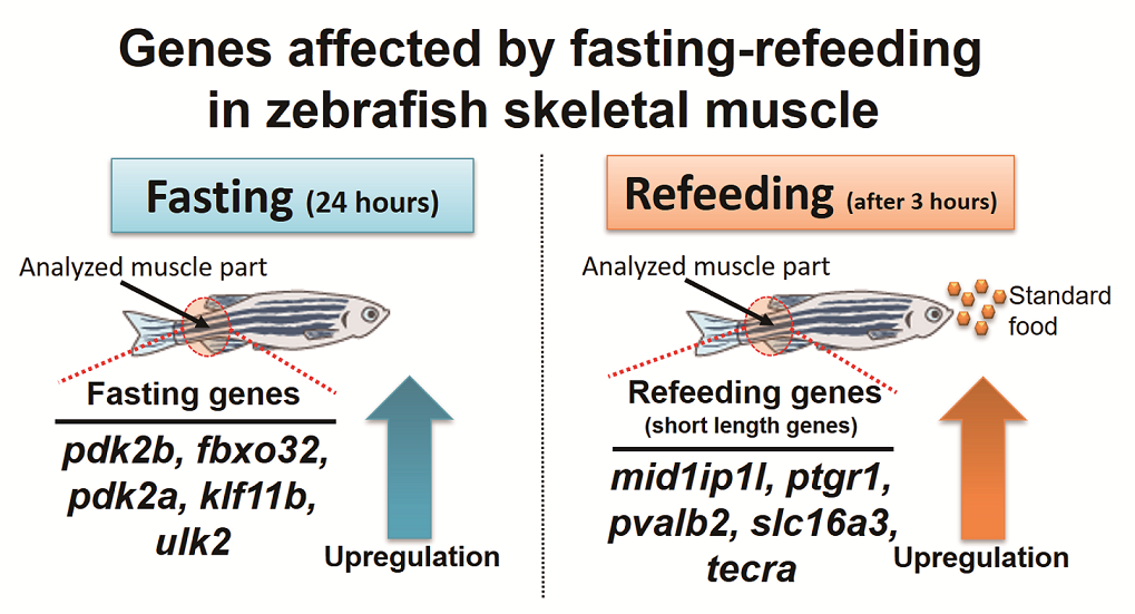 Recently, fasting has been spotlighted from a healthcare perspective. However, the de-tailed biological mechanisms and significance by which the effects of fasting confer health benefits are not yet clear. Due to certain advantages of zebrafish, as a vertebrate model widely utilized in biological studies, we used mRNA-sequencing and bioinformatics analysis to examine comprehensive gene expression changes in skeletal muscle tissues during fasting-refeeding. Our results produced a novel set of nutrition-related genes under a fasting-refeeding protocol. We found five dramatically upregulated genes in each fasting (for 24 hours) and refeeding (after 3 hours), exhibiting a rapid response to the provided conditional changes. The assessment of the gene length revealed, the gene set whose expression was elevated only after 3 hours of refeeding had a shorter length, suggesting that nutrition-related gene function is associated with gene length. Taken together, our results from bioinformatics analyses provide new insights into biological mechanisms induced by fasting-refeeding conditions within zebrafish skeletal muscle.