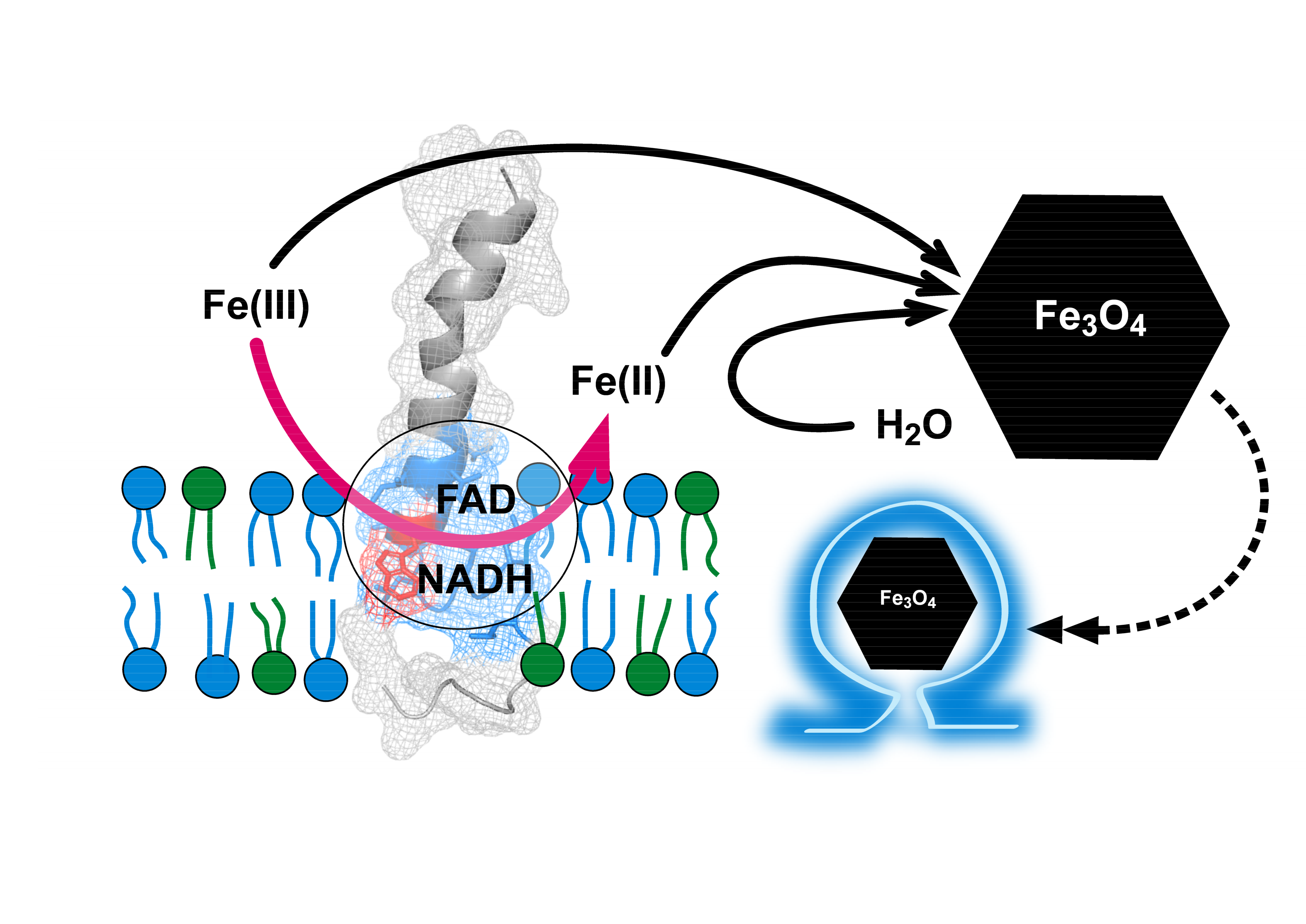 Magnetosomes of magnetotactic bacteria consist of magnetic nanocrystals with defined morphologies enclosed in vesicles originated from cytoplasmic membrane invaginations. Although many proteins are involved in creating magnetosomes, a single magnetosome protein, Mms6, can direct the crystallization of magnetite nanoparticles in vitro. The in vivo role of Mms6 in magnetosome formation is debated and the observation that Mms6 binds ferric and not ferrous iron raises the question of how Mms6 could promote the crystallization of magnetite, which contains both ferric and ferrous iron. Here we show that Mms6 is a ferric reductase that reduces ferric to ferrous iron using NADH and FAD as electron donor and cofactor, respectively. Reductase activity is elevated when Mms6 is integrated into either liposomes or bicelles. Analysis of Mms6 mutants suggests that the C-terminal domain binds iron and the N-terminal domain contains the catalytic site. Although Mms6 forms multimers that involve C-terminal and N-terminal domain interactions, a fusion protein with Mms6, which remains a monomer, displays reductase activity, which suggests that the catalytic site is fully in the monomer. These results are consistent with a hypothesis that Mms6, a membrane protein, promotes the formation of magnetite by a mechanism that involves reducing iron.