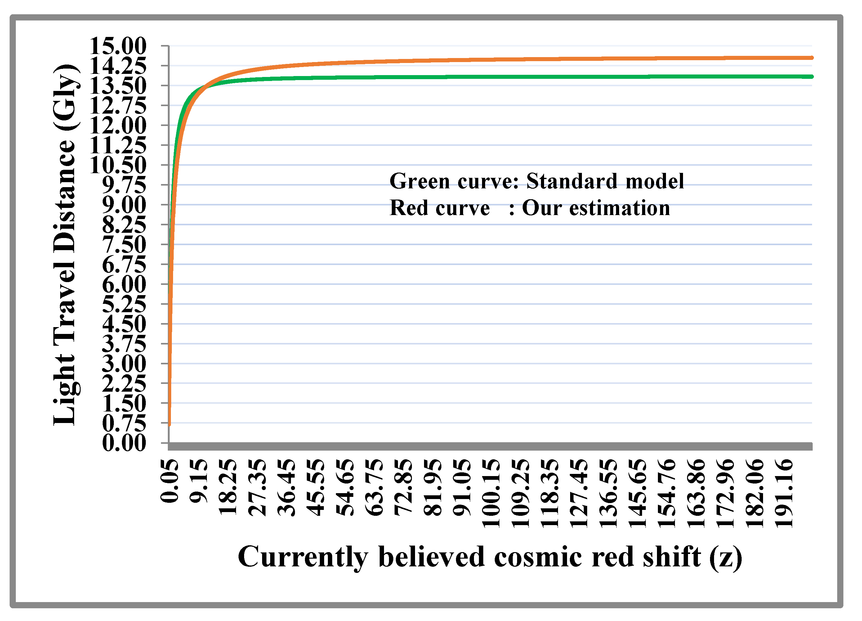 Figure 1. Green curve indicates the light travel distance in Lambda cosmology prepared with Omega matter = 0.32, Omega lambda = 0.68, Omega radiation = 0.0 and