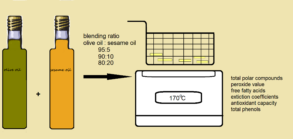 Fresh potatoes were deep-fried in olive oil (OO) & extra virgin olive oil (EVOO) and their blends with 5%, 10% and 20% v/v sesame oil (SO). This is the first report on the use of sesame oil as natural source of antioxidant for olive oil deep-frying. Oil was evaluated for Peroxide Value (PV), Free Fatty Acids (FFA), K232, K270, Trolox Equivalent Antioxidant Capacity (TEAC) and Total Phenols (TP) until Total Polar Compounds (TPCs) reached 25%. Sesame lignan transformations were monitored through Reverse-phase HPLC. While TPCs in olive oils increased at a steady rate, the addition of 5%, 10% and 20% v/v SO created a time window lasting 1, 2 and 3 hours, respectively, where TPCs were constant. SO addition to OO increased the total frying time. Furthermore, the addition of SO reduced the peroxides formation rate for both OO and EVOO. EVOO was more resistant to oxidation than OO as measured by TPCs and TEAC, while frying time raised from 21.5 to 25.25 h when EVOO replaced OO. The increase in frying time for olive oil but not for extra virgin olive oil, after SO addition, is pointing out a niche market for extra virgin olive oil in deep-frying.