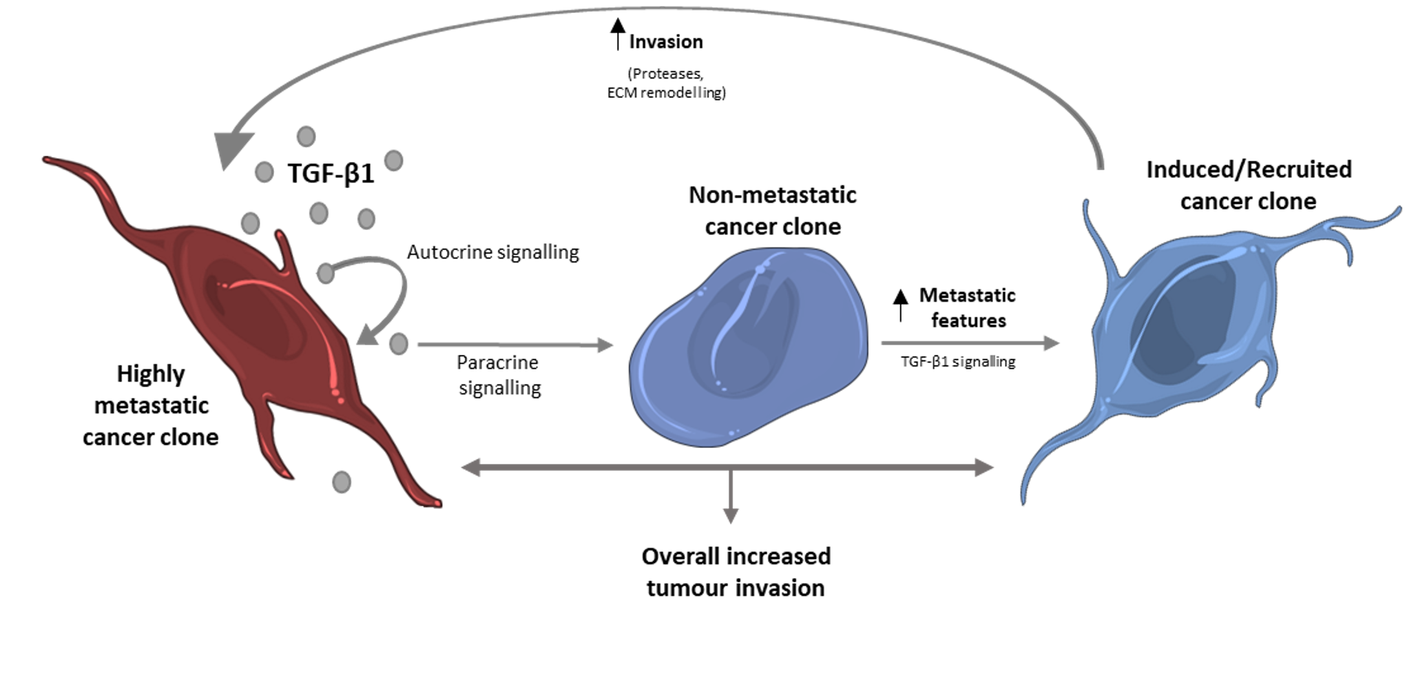 Intratumour heterogeneity is often associated with poor response to treatment and bad prognosis. In addition to constitutive genetic/epigenetic sources, phenotypic and functional heterogeneity can reflect cell plasticity due to changes in gene expression patterns induced by signals from the tumour microenvironment or other cells. Positive interactions between cancer clones can increase their fitness and contribute to tumour growth, resistance to drugs and metastasis. Consequently, understanding the pathways involved in such behaviours is of great significance for cancer treatment. To explore if and how genetically distant clones can synergistically enhance each other's metastatic potential, this study used three (two breast and one lung) cancer cell lines with different aggressiveness levels. We found that (i) the conditioned media from the breast and lung aggressive lines induce mesenchymal features and increase the migration and invasion potential of the poorly metastatic breast line, and (ii) in both cases, this interclonal communication is based on the same soluble factor – namely, the tumour growth factor TGF-β1. Furthermore, when the two breast lines are mixed and co-cultured, the invasive potential of both lines is enhanced, and this outcome is dependent on the recruitment of the less aggressive clone into expressing a malignant phenotype. Based on our findings, we propose a two-tier model whereby highly metastatic clones can recruit weakly metastatic clones into acquiring an invasive phenotype, which in turn augments the invasion ability of the former (i.e., a “help me help you” strategy) through shared proteases and/or ECM remodelling. We suggest that such synergistic cooperation can easily emerge via cross-talk involving metastatic clones able to constitutively secrete signalling molecules that induce and maintain their own malignant state (i.e., autocrine/cell-autonomous signalling) and clones that have the ability to respond to those signals (i.e., paracrine/non-cell-autonomous signalling) and express a metastatic phenotype. Taking into account the lack of therapies to directly affect the metastatic process, interfering with such cooperative behaviours that tumour cells engage in during the early steps in the metastatic cascade could provide an additional strategy to increase patient survival.