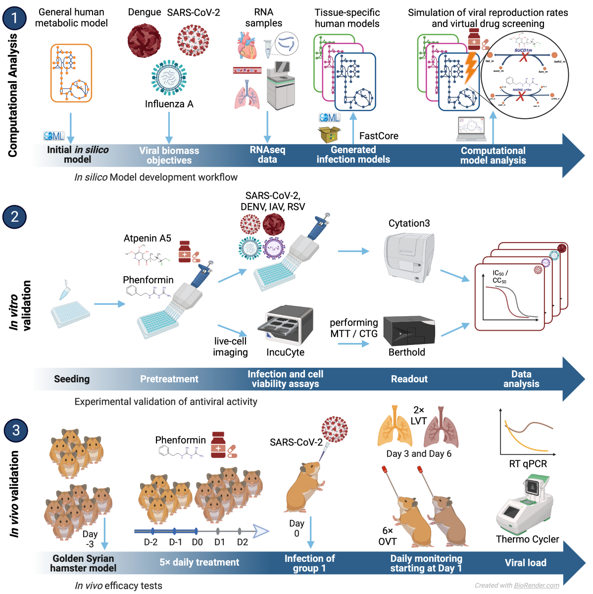 Nevertheless, there are limitations to our study and open questions remain. On the computational side, we applied our workflow only to single-cell RNA-Seq datasets which come with the limitation that typically only a subset of expressed genes is detected (Lähnemann et al., 2020). However, bulk sequencing RNA-Seq data suffers from the disadvantage that it also includes transcripts of genes from cell types that might not be permissible for viral infection. For instance, SARS-CoV-2 is typically only able to infect a small subset of cells in the lung (Ortiz et al., 2020). Moreover, due to the reconstruction of context-specific models for hundreds of thousands of cells being a limiting step in our analysis, we based our approach on Recon2.2 (Swainston et al., 2016) which is much smaller in size than more current reconstructions of human metabolism, like Recon3D (Brunk et al., 2018). The activity of phenformin needs to be characterized in further detail in vitro as well as in vivo prior to upcoming clinical trials. While we observed some weight loss in vivo, this is likely related to an appetite-reducing effect as has been observed for metformin (Scott et al., 2024), the weight trend reassuringly did not change post-infection. Atpenin A5 is of limited in vivo compatibility, and following its proof-of-concept as broad antiviral agents, more work is necessary to render it biocompatible or find other inhibitors of the same target. Moreover, we have only explored a subset of our predicted targets, and other targets from our list might provide an even higher potency for inhibiting viral replication in a broad set of viruses. Hence, ample follow-up studies to the work presented herein are necessary to further explore the capability of our modeling workflow to predict antiviral drugs.
