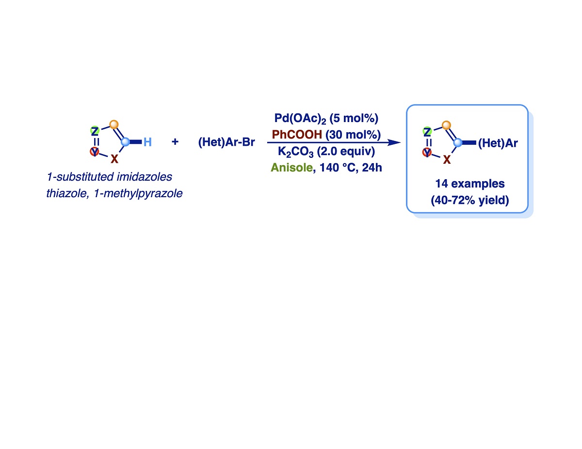 Due to the widespread application of (hetero)arylazoles, the development of straightforward functional group-tolerant synthetic methods that enable selective heteroaromatic elaboration under mild conditions aroused considerable attention. Over the last years we were interested in studies aimed to broaden the substrate scope of the direct functionalization of azoles and, in particular, to develop efficient synthetic protocols for the carbon-carbon bond forming reaction by selective palladium-catalyzed Csp2-H bond activation of imidazole derivatives. During these studies, we discovered that the outcome of the Pd-catalyzed arylation of imidazoles with aryl bromides is deeply influenced by the nature of the reaction solvent. Specifically, it is well known that the Pd-catalyzed direct arylation of imidazoles with aromatic halides selectively leads to C-5 monoarylation products when polar aprotic solvents such as DMF (or DMA) are used as a reaction medium, but these solvents are coded as dangerous according to EHS (Environmental, Health, Safety) parameters. Instead, the use of aromatic solvents as the reaction medium for direct arylations, although some of them show good EHS values, is poorly reported, probably due to their low solvent power against reagents and their potential involvement in undesired side reactions. So, with the intention of filling this gap, in this paper, we have developed a selective C-5 arylation procedure in anisole as the solvent, discovering also the unprecedented role of benzoic acid as a promoter of the coupling.