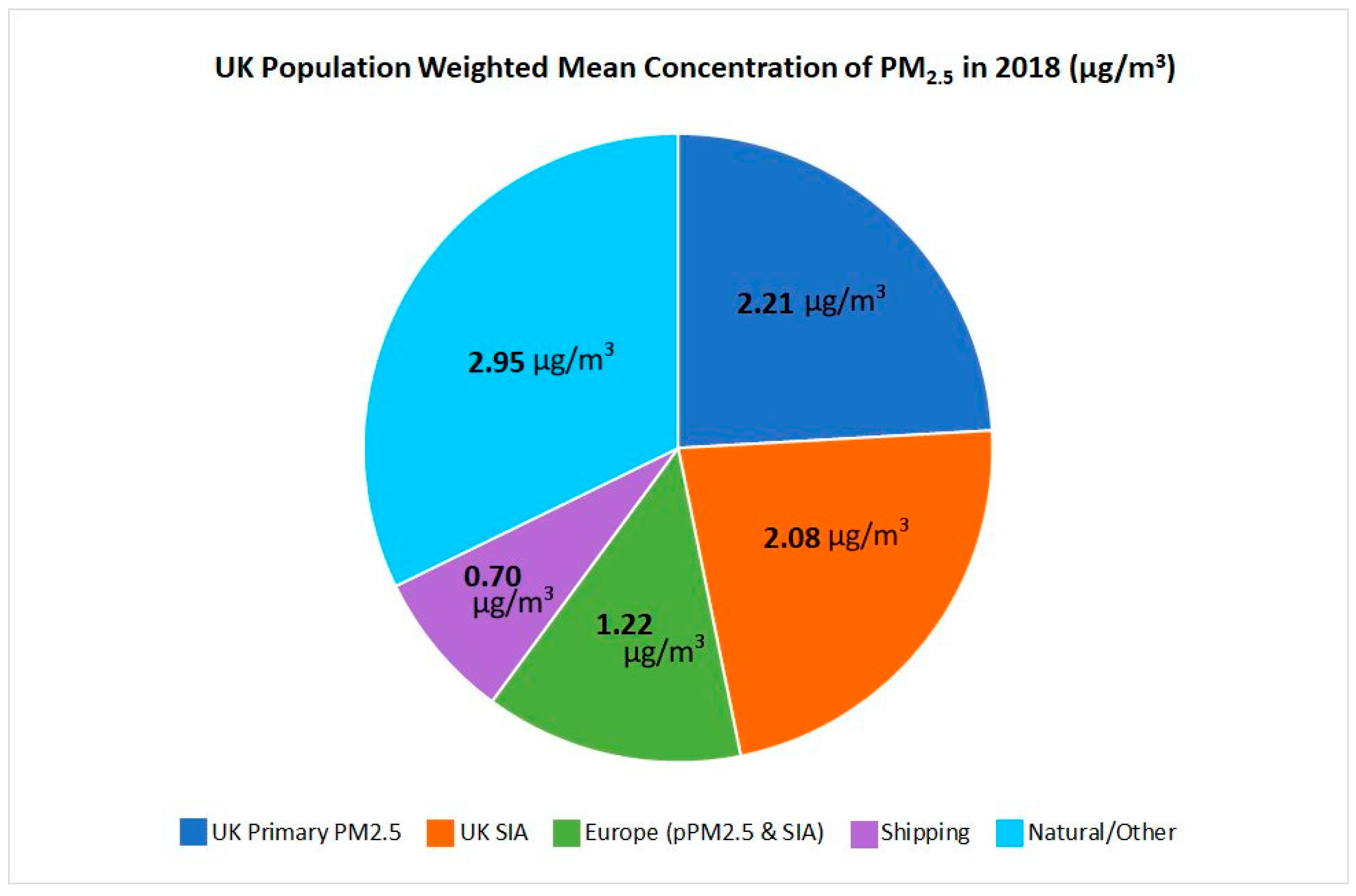 For policy applications, it is also useful to provide source apportionment to quantify the relative importance of different sources, which is easily provided by the UKIAM modelling framework. A breakdown, giving source-apportionment of different contributions to the nationally averaged population weighted mean concentration in 2018 of 9.2µg.m