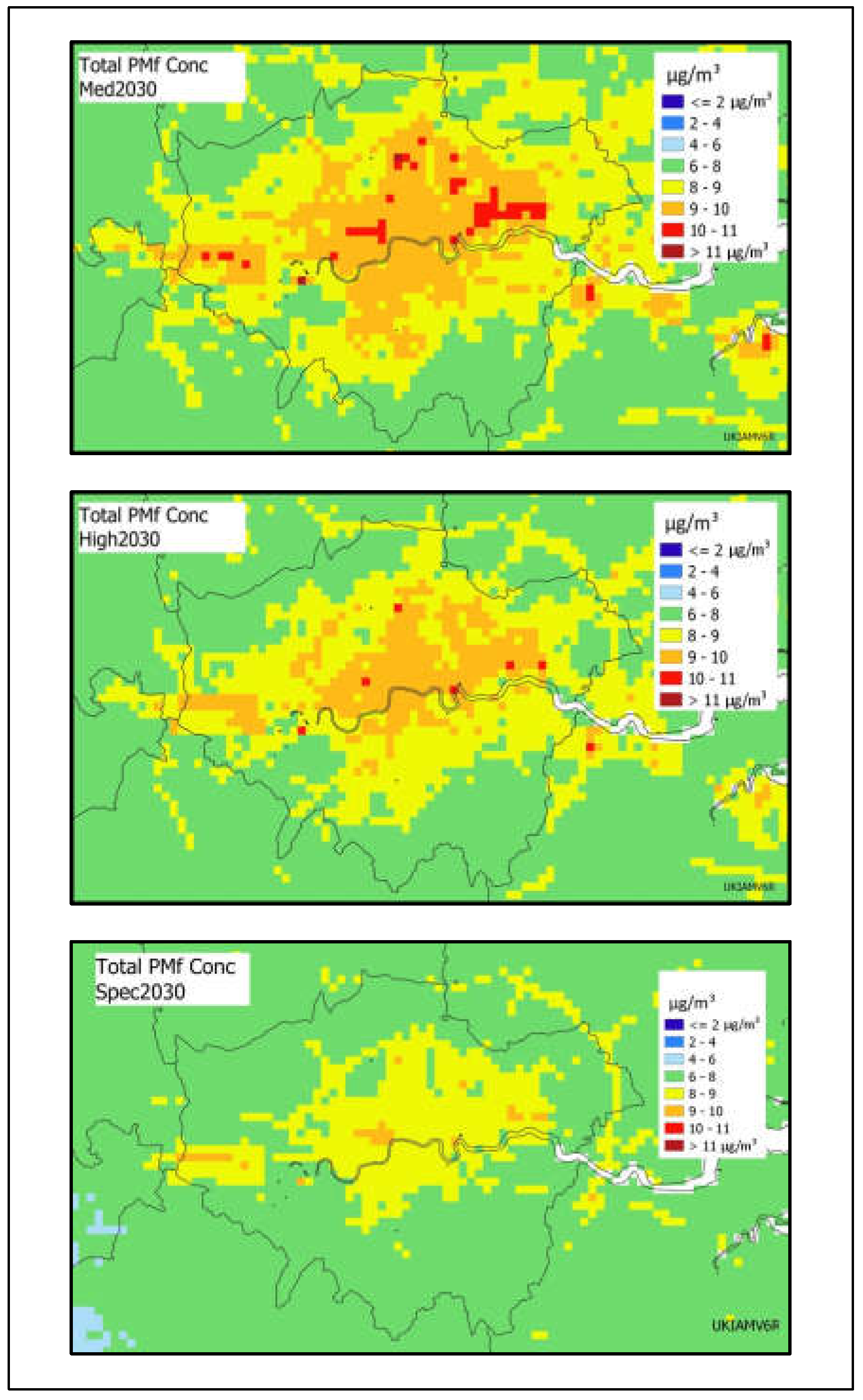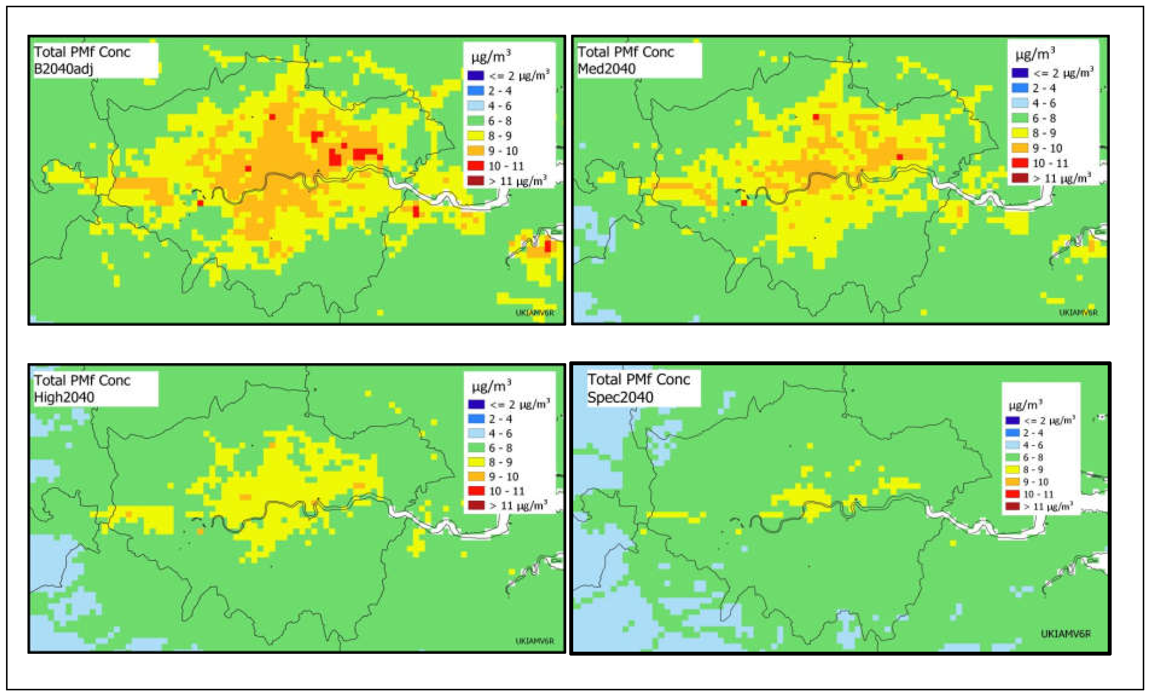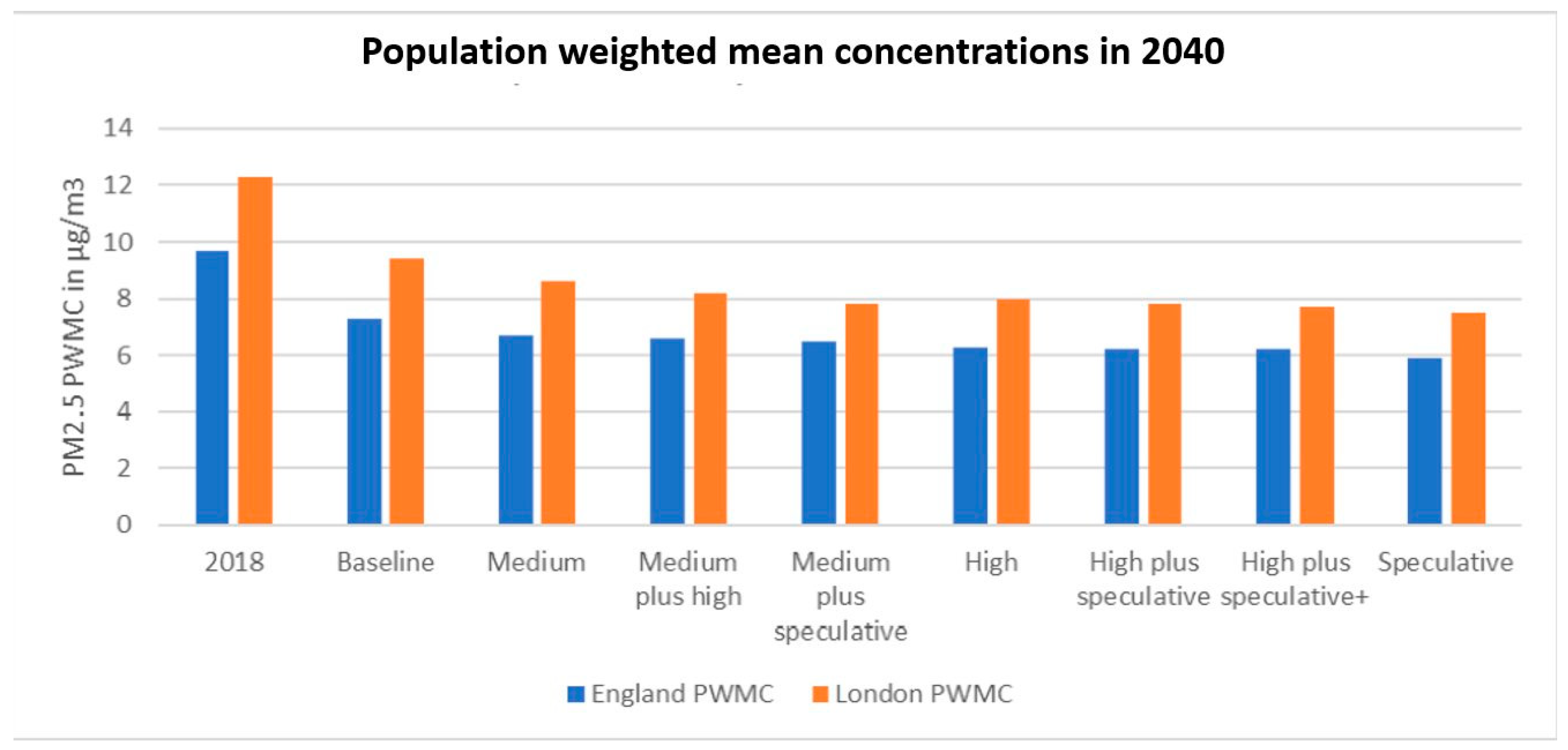 Note that background concentrations from natural sources, and secondary organic aerosol, which is dominated by biogenic sources, remain effectively constant over time for these scenarios. For parts of the UK, especially in the southeast, which is enhanced by contributions from other countries and shipping, these together are already close to or even exceed 5µg.m
