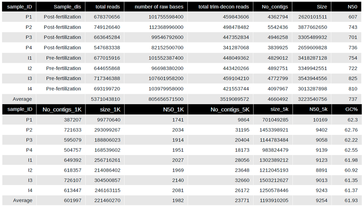 Metagenome assembly statistics with pre- and post-fertilization processing read counts.