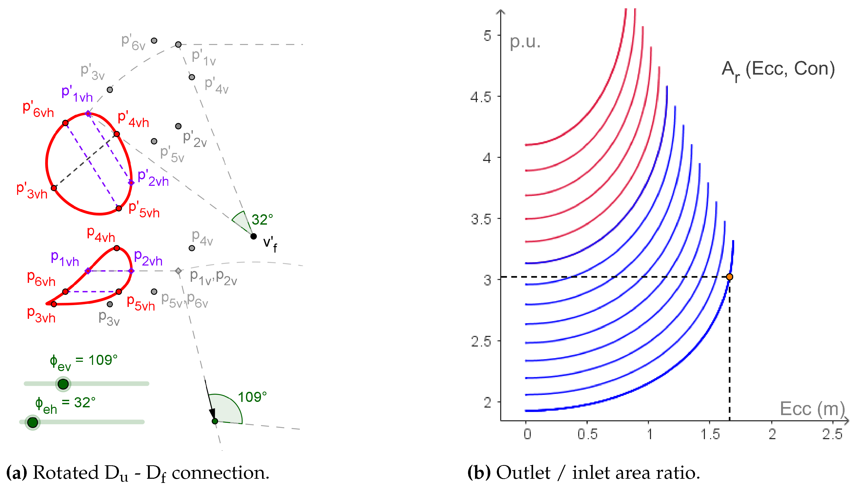- Once the 3D models were computed, we tried to use them for the analysis of the influence of the geometrical parameters in the outlet / inlet area ratio of the fluid duct, , and finally for the optimization of the hopper to achieve in a fast expansion. The model allowed a visual inspection of the fluid duct - upper duct connection through spatial rotation, as well as the plotting and quantitative computation of the relationship between and any geometrical parameter of the 3D system. We used this feature to plot (Ecc, Con) and select the design values Ecc = 1.66 m and Con = 0.09 (Figure 12b). In opposition, the model computed with Solid Edge 2023 does not provide a direct manner to extract the function.