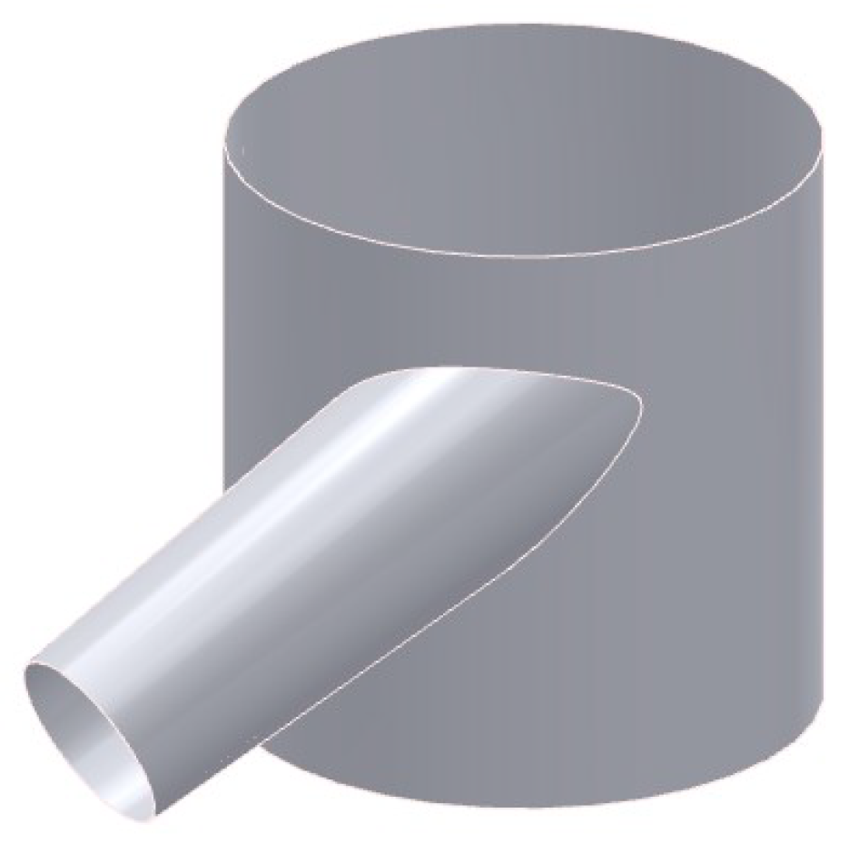 - Feasibility to reach the required models. The 3D model of the hopper, which include the ducts connections were properly obtained both in and CAD, as shown in Figure 13 and Figure 19. Nonetheless, Solid Edge 2023 was not able to compute the flat pattern of the lower duct (truncated cone) because this duct encounters to the oblique cylindrical duct with an intersection of bite type. We used different strategies, as described in the Results section, without success.