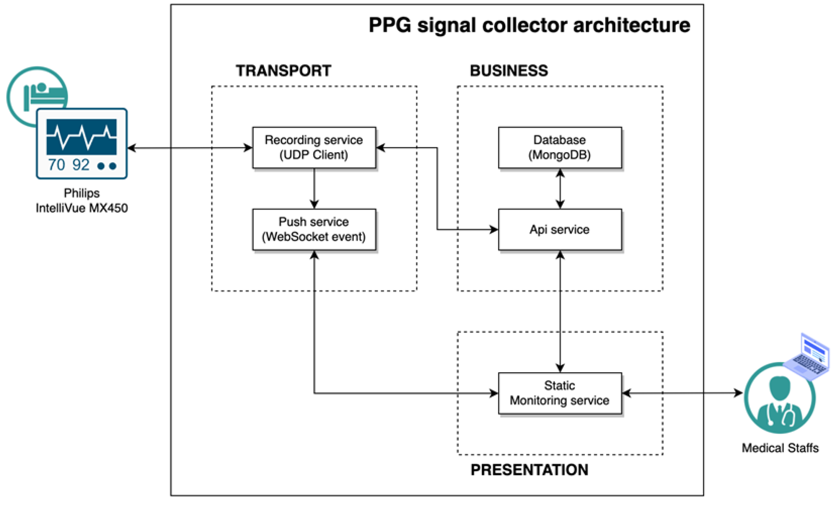 The PPG signal collector receives medical data from the Philips IntelliVue MX450, referring to the interlocking specification provided by Philips [