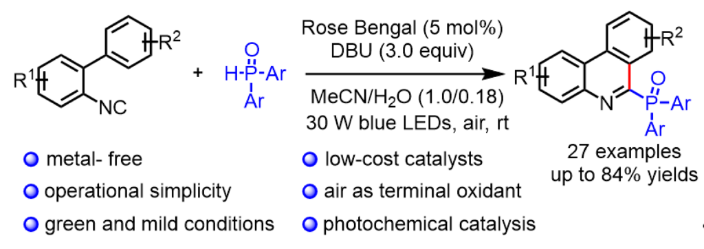 Rose Bengal was found to be an available photocatalyst for the cascade phosphorylation cyclization of 2-isocyanobiphenyls. A wide range of 6-phosphorylated phenanthridines have been synthesized efficiently via visible-light-induced radical addition cyclization under metal-free conditions. Biological screening of these P-containing compounds is in progress in our laboratory.