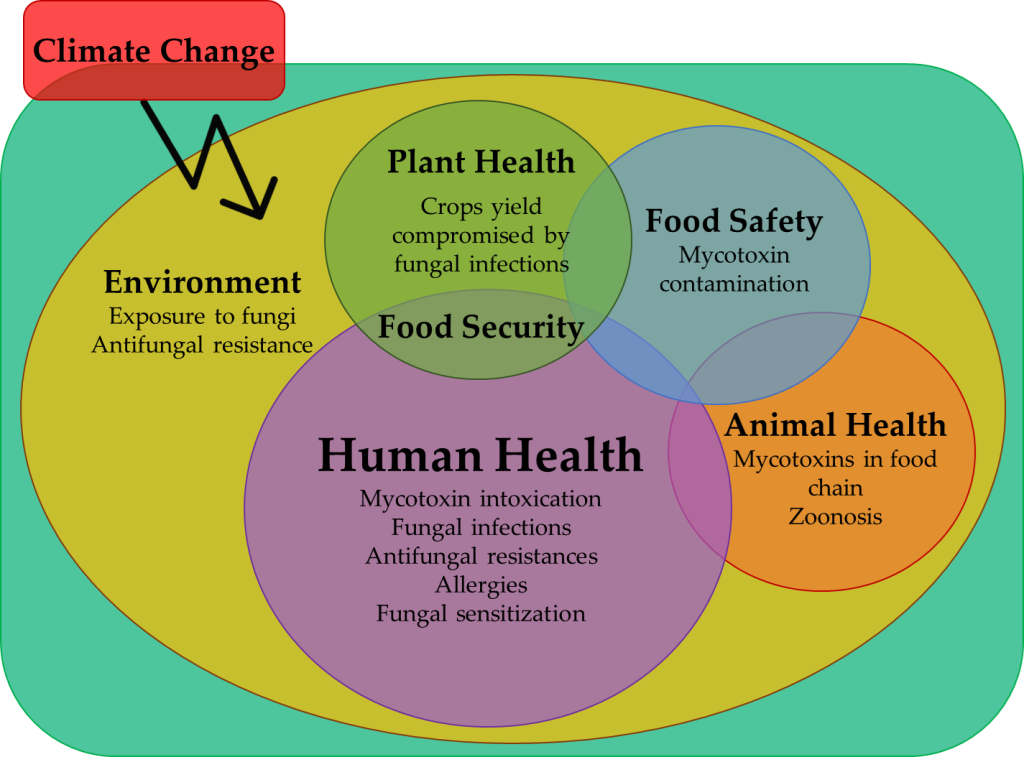 Climate change have a significant role in fungal development, proliferation and distribution, susceptibility pattern, and pathogenicity. Climate change on fungi leads to new environmental pressures that result in the emergence of novel pathogens to plants, animals, and humans, and consequently of new fungal diseases, which may compromise production yield, public health, and wildlife biodiversity [