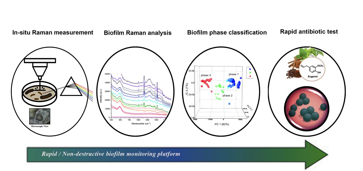 Within an hour, our antibiofilm test was able to immediately detect the most efficient time for biofilm to apply an antibiofilm agent. This shows that eugenol is most potent during the attachment phase, as determined by Raman and CFU calculations. These recently identified natural antibiofilm compounds are interesting prospects for innovative biofilm-associated infection treatments.