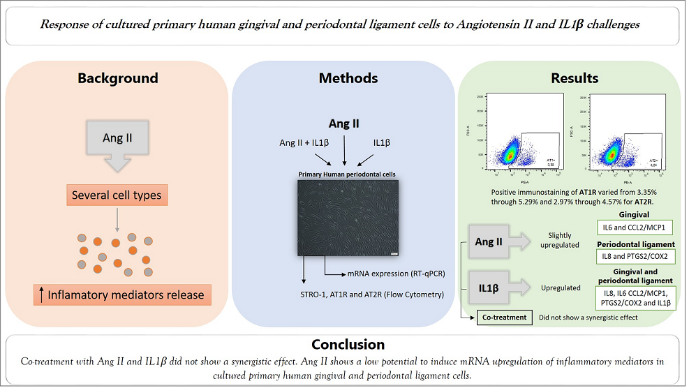 - Gabriele, L.G.; Morandini, A.C.; Dionísio, T.J.; Santos, C.F. Angiotensin II Type 1 Receptor Knockdown Impairs Interleukin-1β-Induced Cytokines in Human Periodontal Fibroblasts. J. Periodontol. 2017, 88, e1–e11. [Google Scholar] [CrossRef] [PubMed]