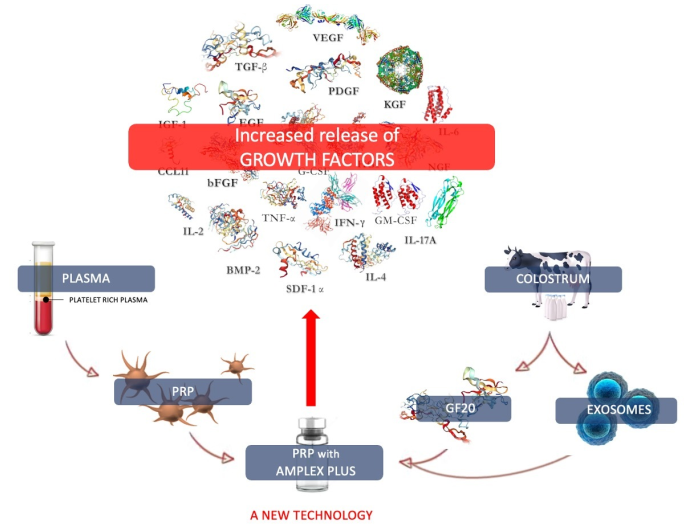 The objective of this research is to evaluate through enzyme-linked immunosorbent assay (ELISA) the concentration of 20 between growth factors and cytokines in plasma, in PRP and in the PRP with AMPLEX PLUS technology. The analysis was conducted to demonstrate that by combining the factors extracted from colostrum in active form (GF20 and exosomes) with platelet concentrates, the activity of the latter is considerably enhanced. The effectiveness of this combination is closely linked to the synergy of the two components and their functional interdependence. The bioactive substances extracted from the colostrum, in fact, bring nourishment to the cells in the growth and proliferation phase and supply further bioactive factors capable of modulating the action of the growth factors already present in the PRP.