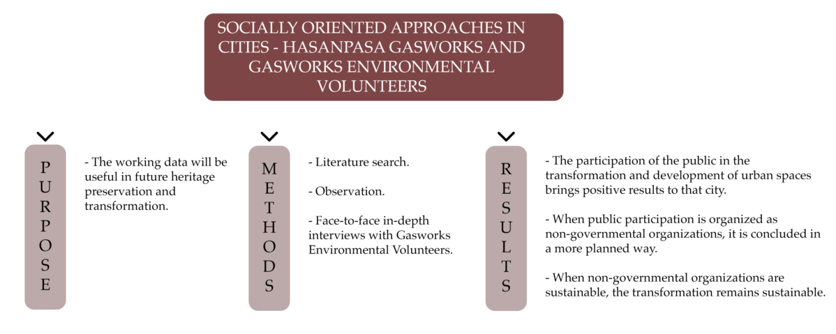 Participants were determined using purposeful sampling. Interviews were conducted with 3 members of Gasworks Environmental Volunteers who have been working since the beginning of the process and are still effective in the management of Gasworks and 1 intern member who took part in the execution of Gasworks activities after the transformation. The average age of the 3 members is 55 – 65 years old and the trainee member is 25 years old. All of the sample group resides in the Kadikoy region around the Gasworks. Group interviews were held with the participants. Pre-prepared questions and question groups are semi-structured questions that may change or be added according to the answers given. The questions are collected under 3 headings to allow evaluation of the hypothesis of the research. In the context of Hasanpasa Gasworks; A total of 28 questions were prepared under the headings of public participation and non-governmental organizations, transformation, and sustainability. However, there were additional questions during the 2-hour interview. The meeting took place in a comfortable environment in the library of Hasanpasa Gasworks. The interview findings were evaluated under the same headings.