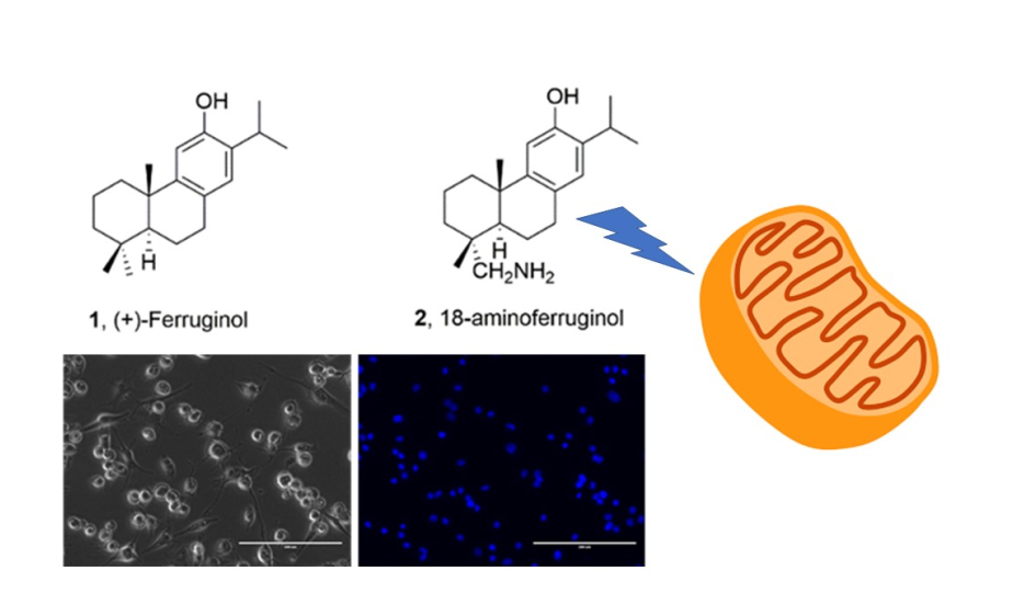 In summary, we demonstrate here that derivatization of ferruginol into 18-aminoferruginol increases its antiproliferative activity 5 times in SK-MEL-28 cells as well as changing the apoptotic mechanism from activation of caspase without depolarization of the mitochondrial membrane.