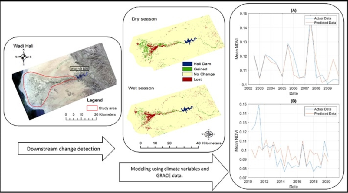 The main objective of this study is to analyze the impact of the Hali dam construction on downstream vegetation areas using satellite remote sensing. In addition, it investigates the potential impact of the local climate on downstream vegetation areas over the Wadi Hali basin, located in Saudi Arabia. Due to its highly arid conditions, the Hali basin's climate is characterized by a harsh combination of extreme heat, high evaporation, and limited surface water. Furthermore, it is characterized by a long dry season marked by severe drought and a short wet season with irregular rainfall (Hasanean & Almazroui, 2015). Geographic information systems (GIS) and remote sensing were used to study the vegetation areas changes and the corresponding impact of local climate variabilities. GIS and remote sensing provide essential data and tools for spatiotemporal detection modeling at a local and global scale for the past, current, and future. Several changes in vegetation can be detected and monitored through remote sensing, including changes in aboveground production, structure, and cover (Almalki et al., 2022). Vegetation areas change detection is critical for understanding the interaction and interrelationships of the ecosystem, climate, and human activities. Monitoring vegetation changes at different spatial and temporal scales using this technique is also important to detect changes in vegetation structure, function, and interaction with climate variabilities (Ahmed, 2018; Belal et al., 2014; Murray & Khaki 2021).