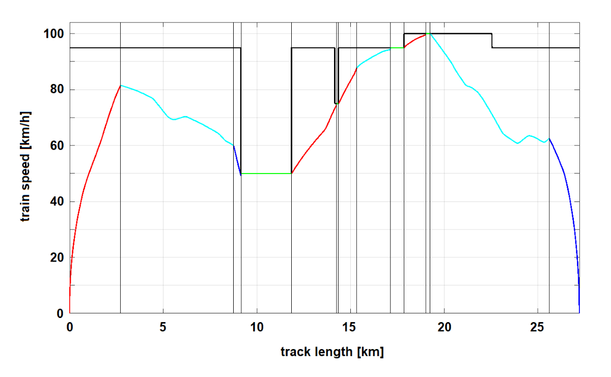1] developed a model that covered variable altitude, variable speed limit, continuous traction control, arbitrary maximum tractive and brake force depending on speed, quadratic train resistance with respect to speed, and exclusively regenerative braking. Regarding this features, it is a broadly applicable approach with little restrictions. Due to this advantages, the algorithm of Khmelnitsky has been chosen as the basis for our research. In a recent article by Ying et al. [
