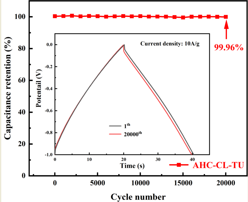 -1 for GCD curves, and electrochemical impedance spectroscopy (EIS) at scan frequencies between 0.01 Hz and 100 kHz. On the Land cell test program, the cycling stability was examined through 20,000 cycles at 10 A g