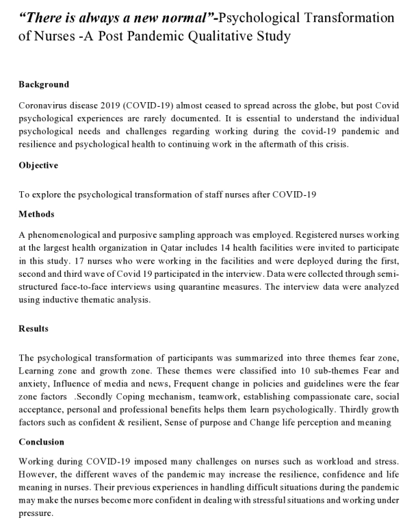 In this phenomenological study, the effect of the COVID-19 pandemic on nurses' psychological health was examined. Since we only interacted with 17 Nurses from various HMC facilities who expressed a willingness to participate, the study's scope was constrained. The potential for selection bias and unequal distribution of nurses based on expertise and gender was another drawback. Last but not least, Even though the study exploring the post Covid psychological stage the interview was done months after the 3 rd wave of COVID-19 pandemic in Qatar which cause the responses might have forgot the initial psychological issues related to the pandemic