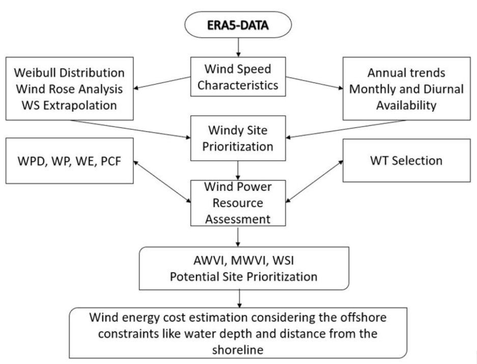 Figure 3, the ERA5 data is downloaded for six locations in the Gulf of North Suez. Next, wind speed characteristics such as long-term, annual, monthly, and diurnal variations; prevailing WD, frequency analysis, annual and monthly wind variability indices, and windy site identifier are estimated. After this; wind power, wind energy, plant capacity factor, etc. are determined for selected offshore wind turbines. Based on variability indices, the energy output, and the plant capacity factors; the windy potential sites suitability for offshore wind farm development are identified. Finally, the cost of wind energy generation per kilowatt hour is determined for three most suitable sites considering the additional construction costs of water depth and the distance from the shoreline. The mathematical equations of wind power resources assessment parameters are provided in Section 4.3.1–4.3.3.
