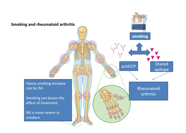 34]. Smoking is known to cause immunological responses that are HLA-DR-restricted to autoantigens modified by citrullination. Smokers clearly run a higher risk of producing anti-CCP antibodies, and in genetically predisposed persons with the common epitope HLA-DRB1 gene, this risk seems to be correlated with the severity of the condition [