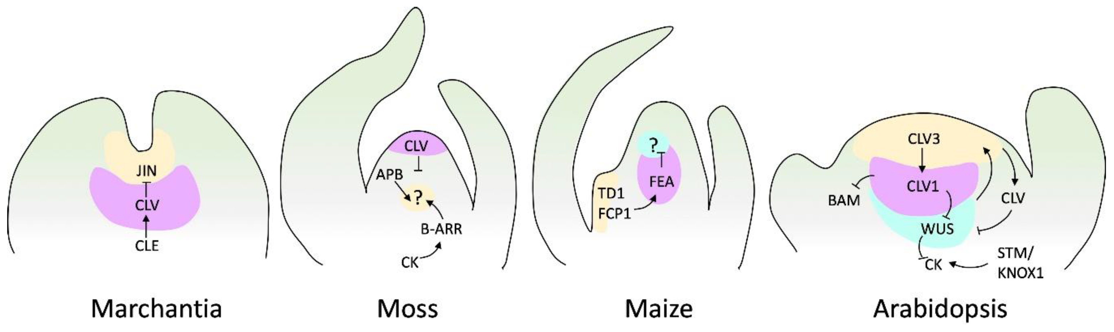 - Somssich, M.; Je, B.I.; Simon, R.; Jackson, D. CLAVATA-WUSCHEL Signaling in the Shoot Meristem. Development 2016, 143, 3238–3248. [Google Scholar] [CrossRef] [PubMed]