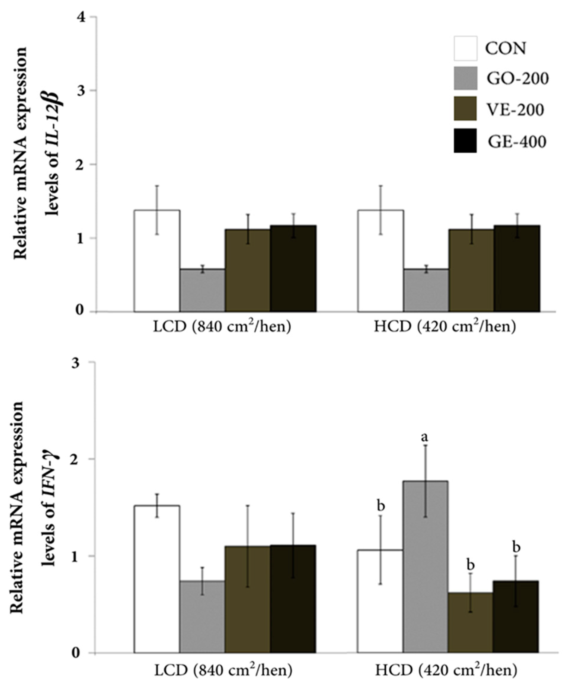 Figure 2). However, HCD-housed hens had a decrease (P < 0.05) in HMGCR abundance within the VE-200 group compared with the CON group. Among hens kept in HCD-conditions, those fed GO-200 exhibited the highest level of IFN-γ mRNA abundance relative to other diets. However, there was no difference in abundance of HSP70 and IL-12 β in HCD-reared hens regardless of diet.