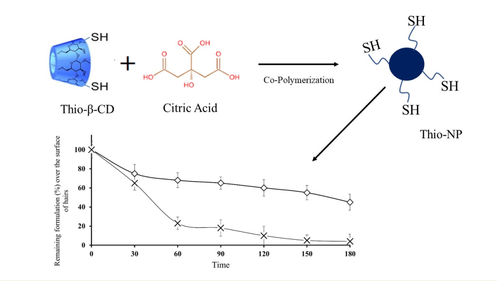 Cyclodextrins (CDs), cyclic polysaccharides with 6-8 units of glucopyranose, are enzymatically produced by the mortification of starch (5, 10). CDs have a lipophilic cavity for the encapsulation of active drug molecules, and CDs encourage the sustained and extended release of encapsulated model drugs. CDs have been recognized as the smallest known drug carriers and are capable of enhancing the dissolvability of numerous drug molecules by the development of comparatively persistent inclusion complexes. CDs have a high affinity for a particular drug molecule because of their carrier system, which equips them with a specific drug release profile (11, 12). Previous studies from our research group have demonstrated that thiolated cyclodextrins provide the advantage of covalent bond formation through thiol/disulfide interchange reactions with cysteine-rich subregions on hair surfaces or other dermal appendages. Therefore, the aim of this research was to develop inclusion complexes of MXD with thiolated β-CD-SH (13). Thiol moieties attached to β-CD-SH develop covalent bonds with the disulfide bonds of alpha keratin. The inclusion complex of MXD with β-cyclodextrin will be formed to enhance its water solubility, which will further improve its activity.