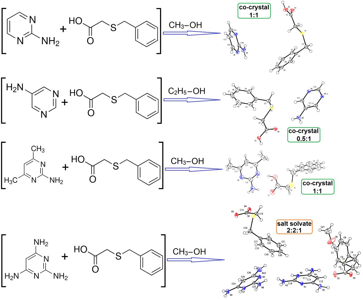 The co-formers and solvents used in co-crystallization experiments were commercial products without further purification. (Benzylthio)acetic acid (purity 97 %) was sourced from Sigma-Aldrich. 2-Aminopyrimidine and 5-aminopyrimidine of analytical grade were purchased from Fluorochem Ltd.. 2-Amino-4,6-dimethylpyrimidine (purity 98%) was received from Alfa Aesar GmbH, whereas 2,4,6-triaminopyrimidine (purity 97 %) was procured from Acros Organics B.V.B.A.. The short-chained alcohols (methanol and ethanol) were provided by Avantor Performance Materials Poland S.A. (formerly POCH S.A.).