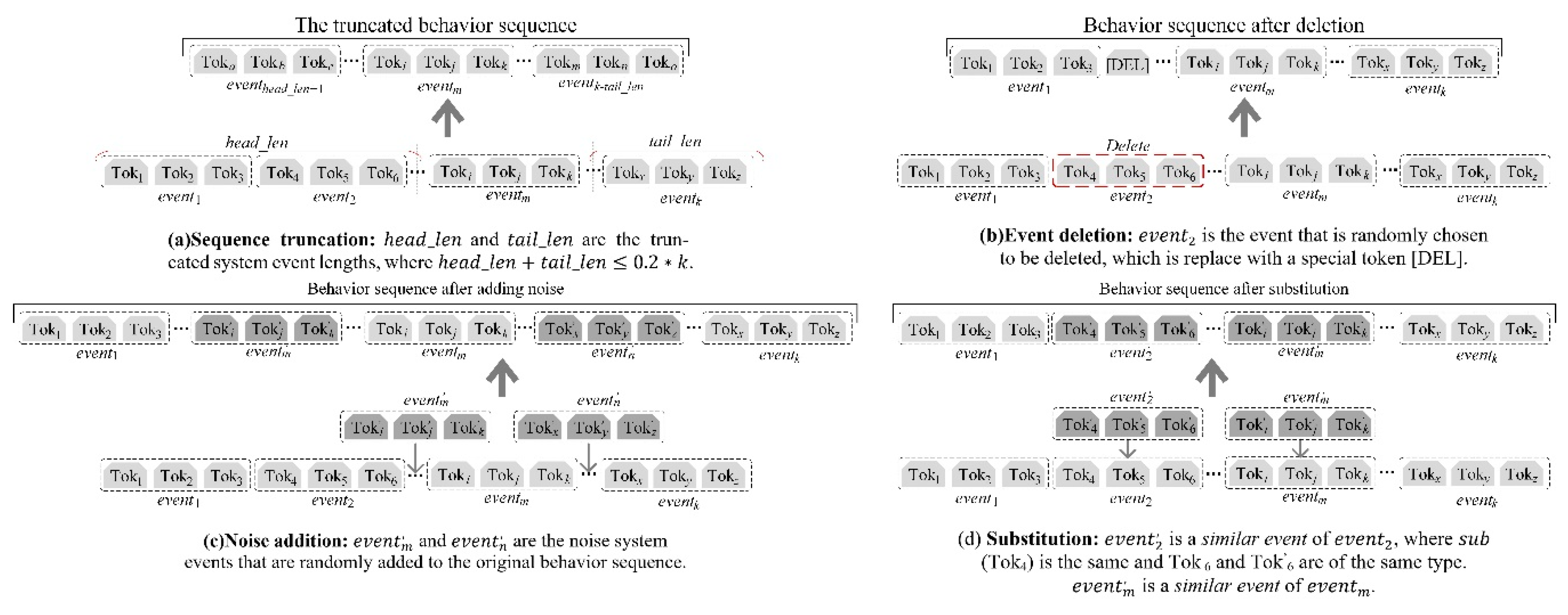 (b) Event deletion randomly selects events in the behavior sequence and replaces them with a special token [DEL]. Percentage of events deleted was 20%. This strategy simulates scenarios where some system events were not recorded by the monitor tools or were lost.