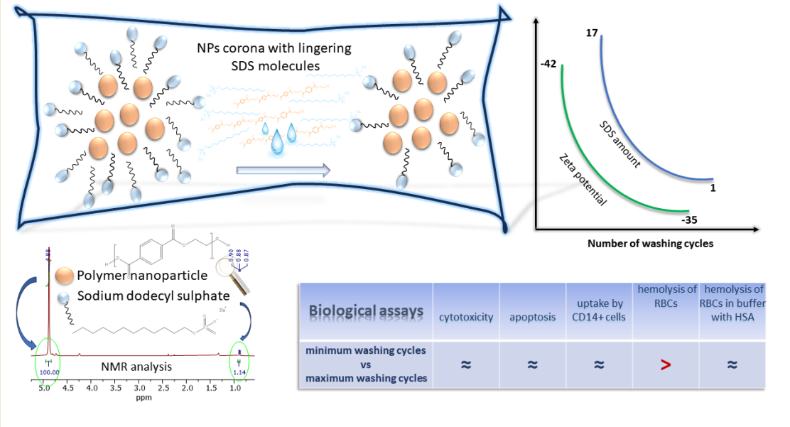 In this work, we have synthesized NPs based on polyethylene terephthalate (PET) by nanoprecipitation method using ionic surfactant sodium dodecyl sulfate (SDS). We have established 1H NMR spectroscopy as a quality control for ionic surfactant presence throughout purification procedure to monitor semi-quantitatively the ratio of surfactant to NPs. The modeled particles of different stages of purification were subject to biological assays, such as red blood cells hemolysis, cytotoxicity, ROS production, apoptosis of primary mononuclear cells and uptake by CD14+ primary mononuclear cells. We demonstrate that for a wide range of surfactant/NP ratio, no difference in cytotoxicity was observed between particles of different purification stages, but the trace amounts of surfactants present accounted for differences observed in protein-free media.