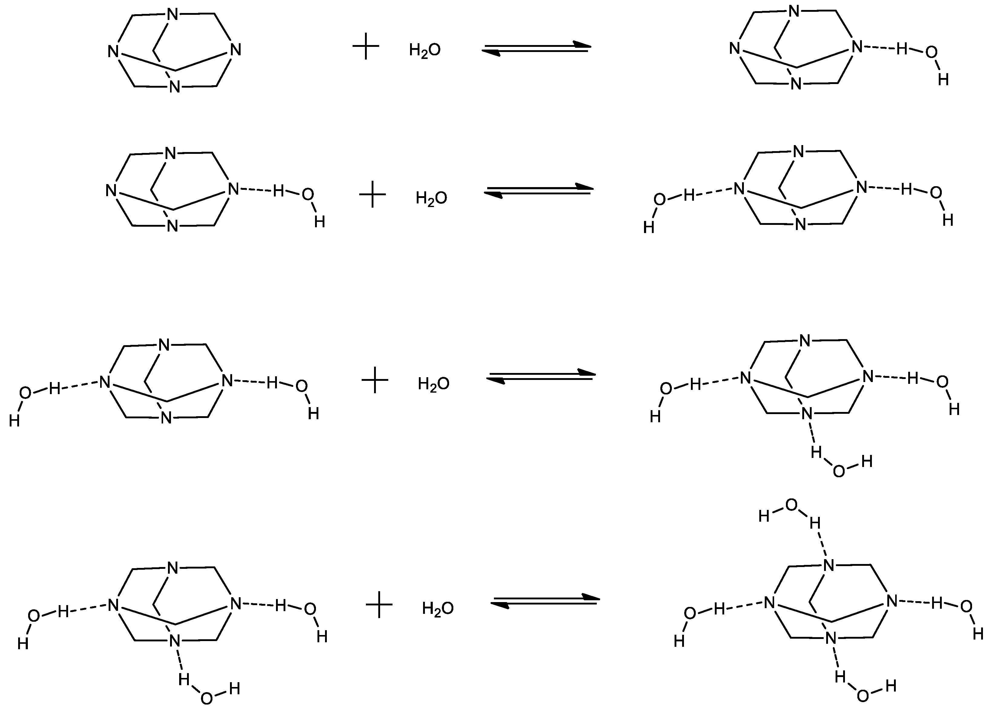 - Chettiyankandy, P.; Chand, A.; Ghosh, R.; Sarkar, S.K.; Das, P.; Chowdhuri, S. Effects of hexamethylenetetramine (HMTA) on the aqueous solution structure, dynamics and ion solvation scenario: A concentration and temperature dependent study with potential HMTA models. J. Molec. Liq. 2019, 296, 111820. [Google Scholar] [CrossRef]