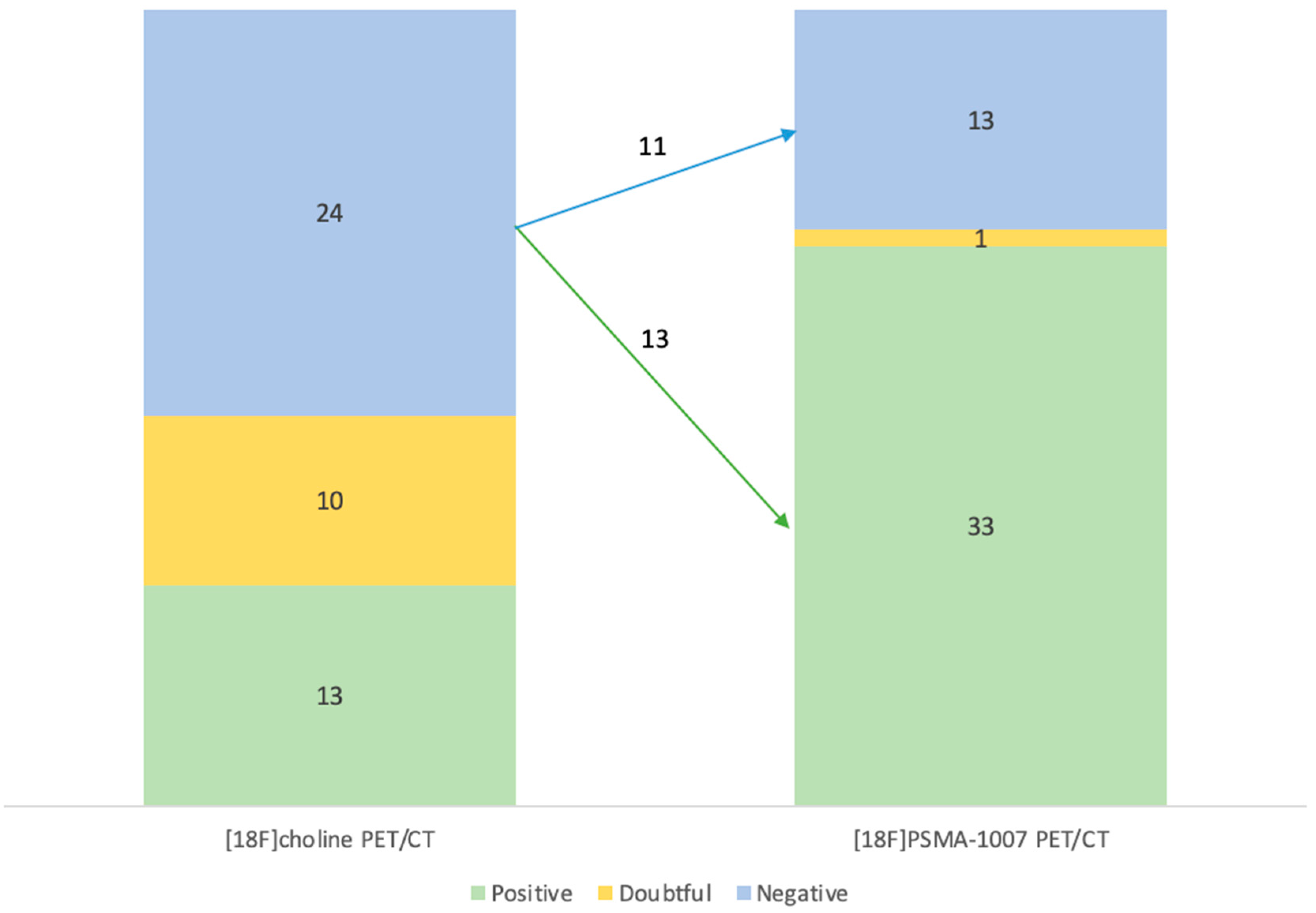 Distribution of the results of the [18F]F-Choline and [18F]PSMA-1007 PET/CT and the modification of negative [18F]F-Choline PET/CT after [18F]PSMA-1007 PET/CT (number of examinations).
