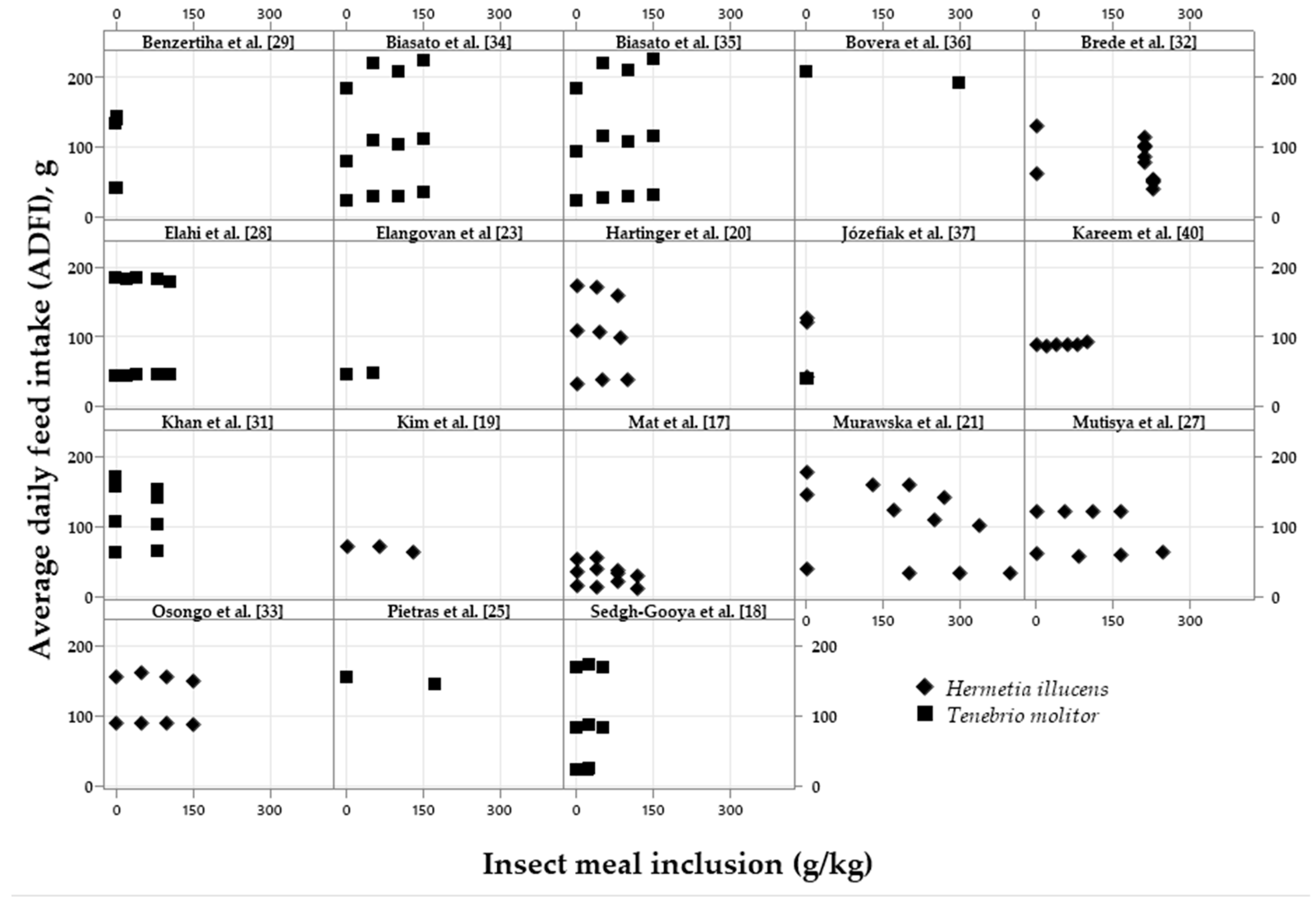 | Bellezza Oddon et al. [59] | Live TM and HI larvae and impacts on health | 5% of ADFI2 with larvae of TM or HI | Gut histomorphology index and histopathological alterations were not influenced by HI and TM larvae. No effects on hematological and serum parameters |